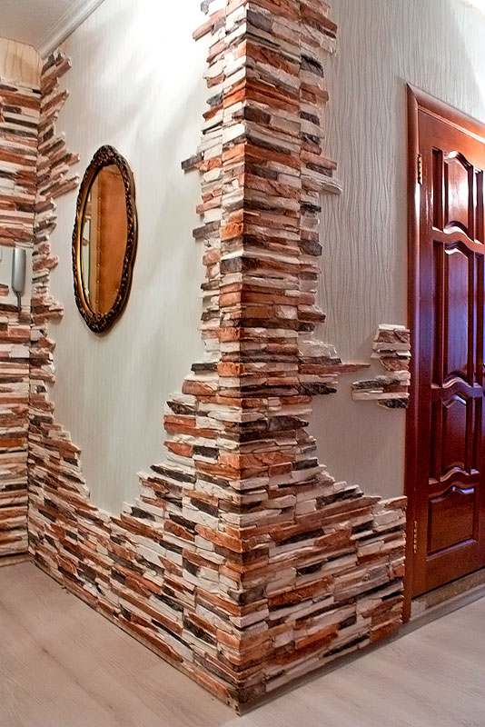 - A rock: small hallways can be made in stone. This decor element is used to decorate the corner parts and niches, besides, the interior stone looks interesting in the design of the doorway. The material creates the impression of solidity and comfort.