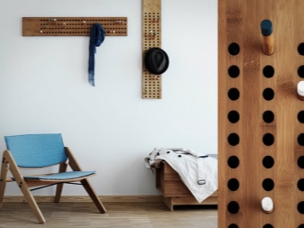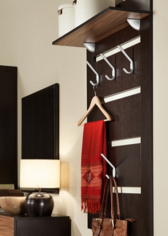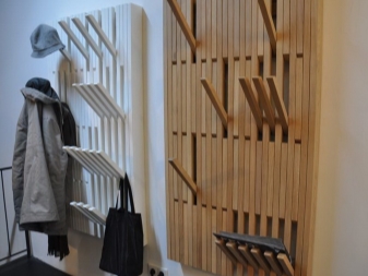 Horizontal wall hanger can be placed in a secluded corner of a small hallway. Option visually expands the wall space. The base is a rectangular board with hooks, but there are more interesting shapes.
