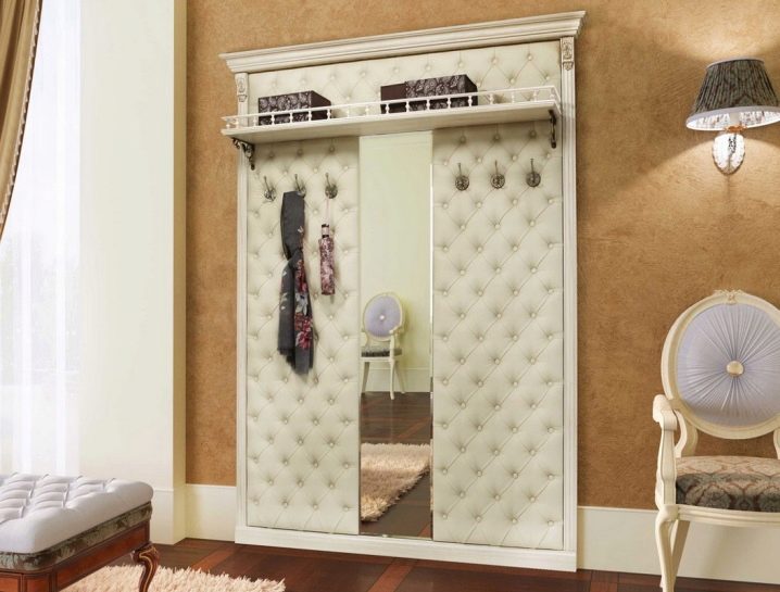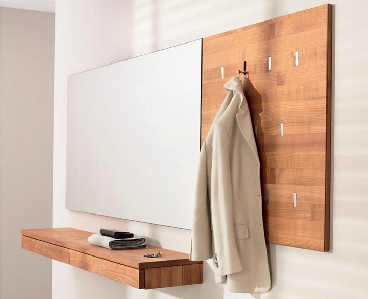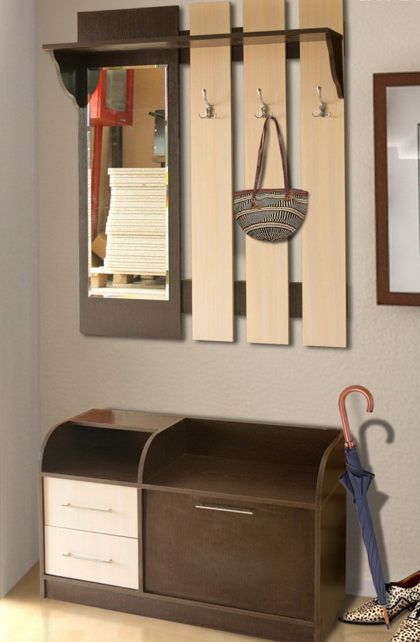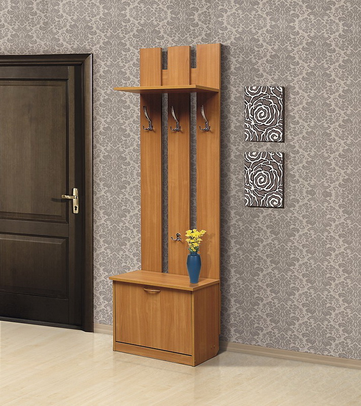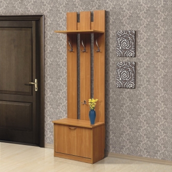 Hanging with a pedestal is ideal for a small hallway where it is impossible to place a closet. Structurally, this is a panel with hooks, which at the bottom rests on a bedside table, which can be used to accommodate the necessary details, as well as shoe care products, handbags and umbrellas.