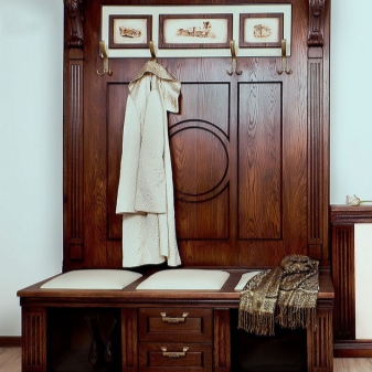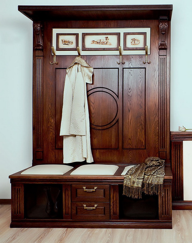 - For classic design the hallway hanger made of wood has a sleek decor. For classics, a technique is typical when the bar is upholstered with leather or leatherette. As a material of classical models, an array of expensive tree species is used. A hanger may look like a large panel or a few vertical slats. The main decorative element in this case is the natural beauty of the tree itself, which must be emphasized with varnish. Presentable appearance of the hanger will add hooks in bronze or gold-plated.