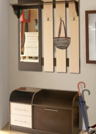 With the help of a wall hanger with a shoebox, you can maintain order in the hallway and save space, since there will no longer be needed additional shoe shelves.Footwear niches can be open or closed, quite a large number of pairs of shoes are perfectly placed there. For a quick search for the desired model, the shoebox is equipped with a turning mechanism. For greater convenience, the kit includes a soft bench.