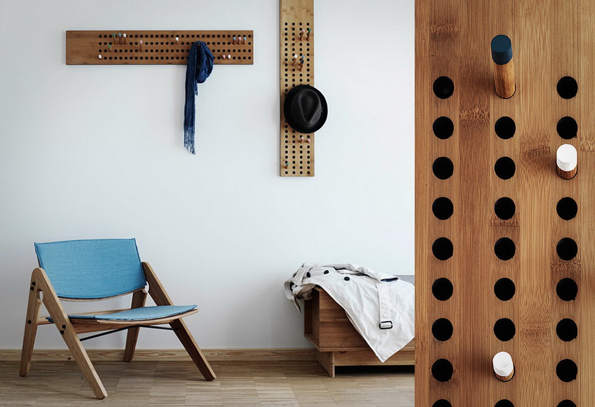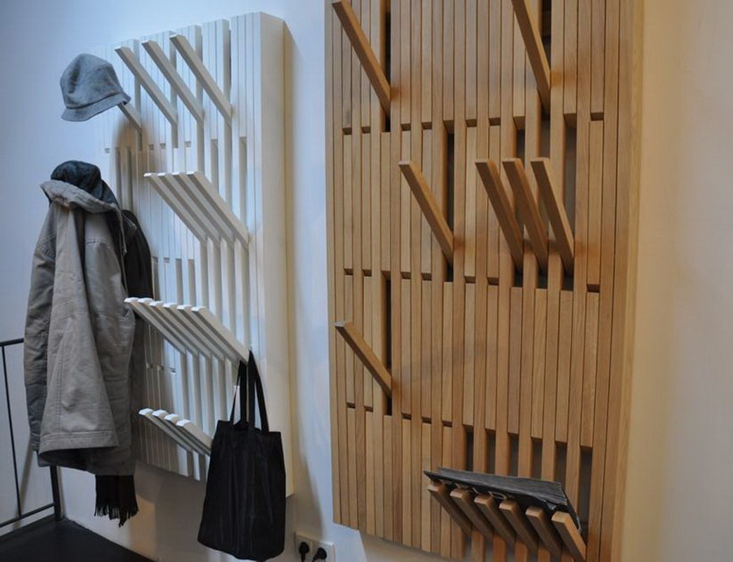 An extremely simple and very original idea - with bent hooks. The designer wall hanger is made of wooden planks, it looks like a panel with vertical stripes. Hooks are made in the same plane with the body. In order to hang the coat, the desired hook is bent, then when it is not needed it is again compared to the surface of the body.