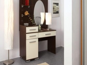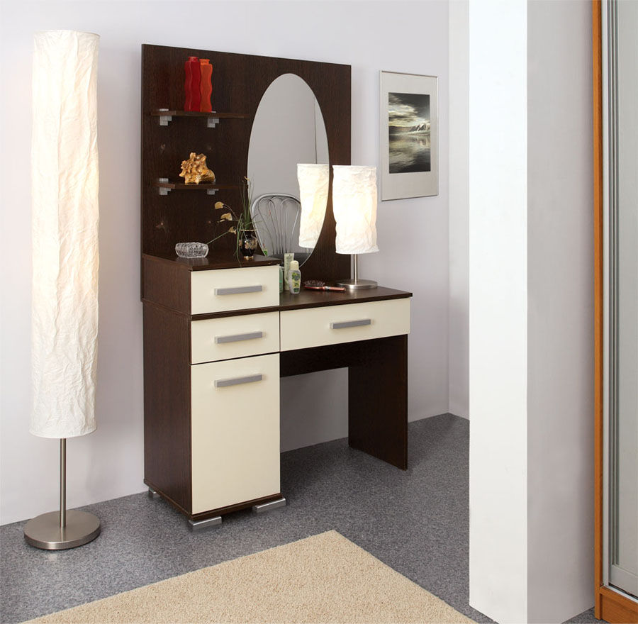 Most often, for the manufacture of small dressing table using artificial materials such as plastic and chipboard. To visually facilitate the design, use clear glass. Smooth, glossy surfaces and chrome parts visually expand the room, due to the play of light. The most common colors of these models: beige, light gray, light brown, milky, white.