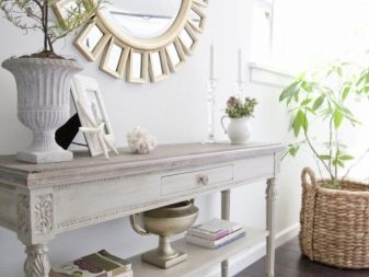 White pierum is ideal for a hall in the style of Provence. The ideal model is a table with the effect of aged wood, decorated with a floral print.