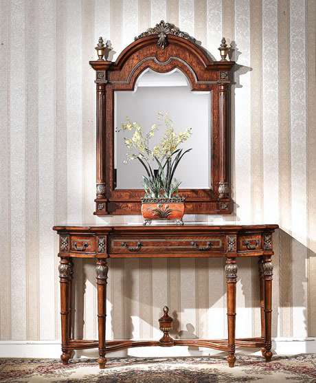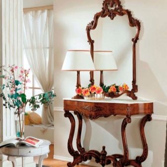 Elite and expensive models are made from natural wood. Particularly appreciated products from rare and valuable varieties of wood. Particular attention is paid to the frame around the mirror. It is decorated with patina, patterns, figures and other things. Models to order make out this gilding, as well as precious and semi-precious stones.