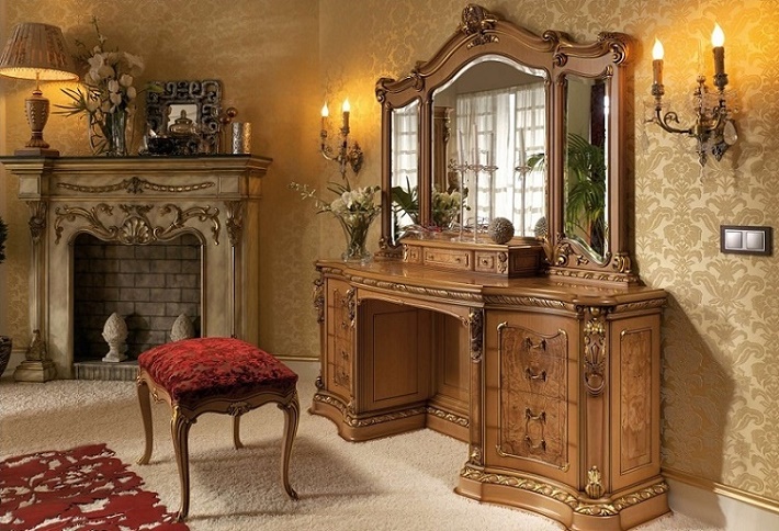 Natural wood with original natural patterns is the best choice for traditional styles. Models decorated with gold and three-dimensional figures, designed for the Empire, Baroque and Rococo directions. The furniture is characterized by smooth and smooth forms.