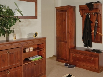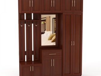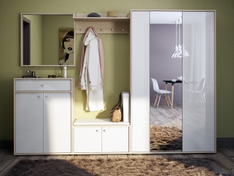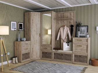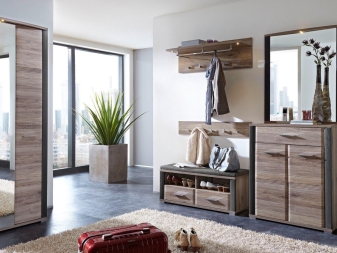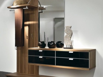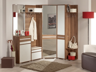 Combined modular headsets are practical, but suitable for large rooms. In their complexion can be not only seating, small chest of drawers, but also cabinets.To save space, it can be replaced by rods with hangers or coat hooks. These structures can be both straight and stand in the corner.