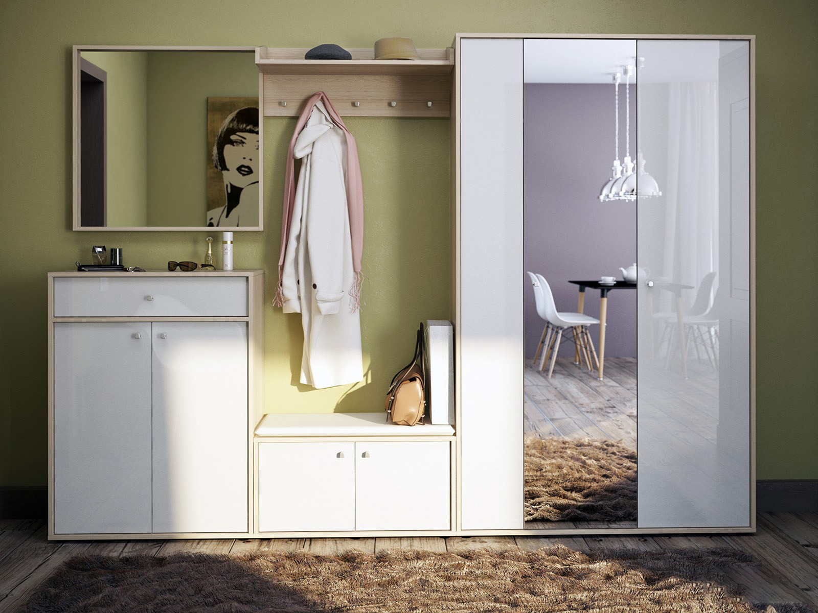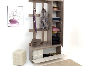 Stylish and concise option for an open or small hallway. A low open shoe pedestal is completed by a bench on which it is comfortable to sit and shoe. Nearby stands a tall narrow chest of drawers with a drawer and opening doors. It can store shoes or small items, as well as accessories. A shelf with a bar for hangers and coat hooks hangs above the low pedestal. White furniture fits well into the interior of natural beige colors.