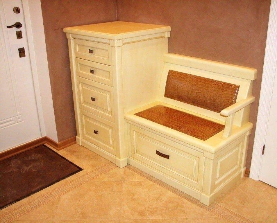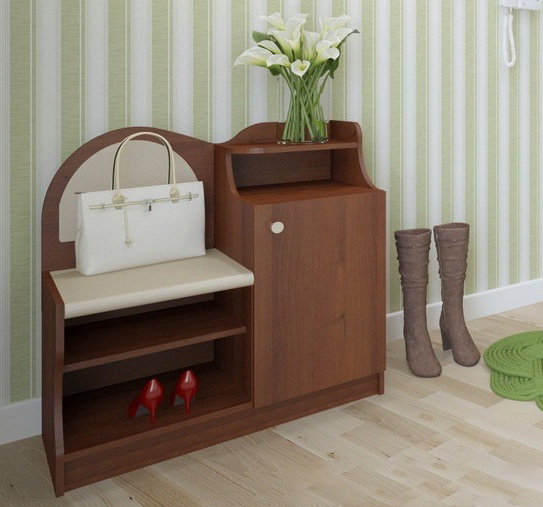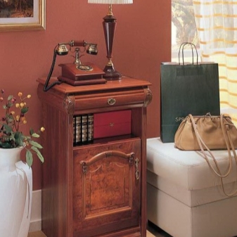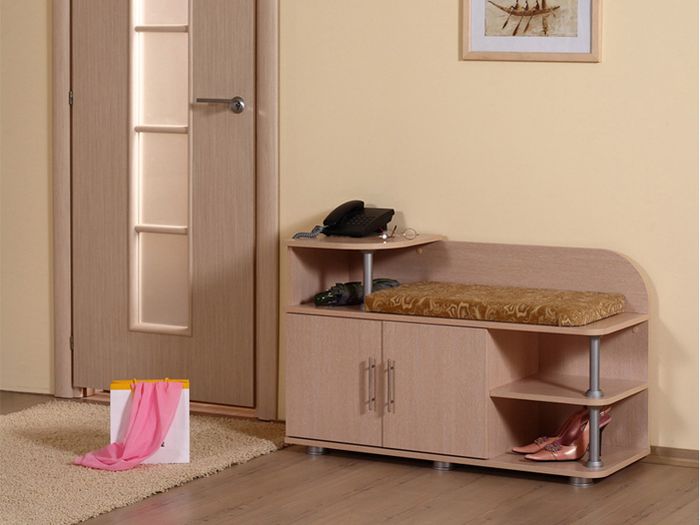 Seating seats often come complete with thumbs. It may be small ottomans, narrow benches and benches, couches. The choice should depend on the dimensions of the room. Below them may be additional shelves or compartments. This type includes products under the landline phone, which are now not always relevant.
