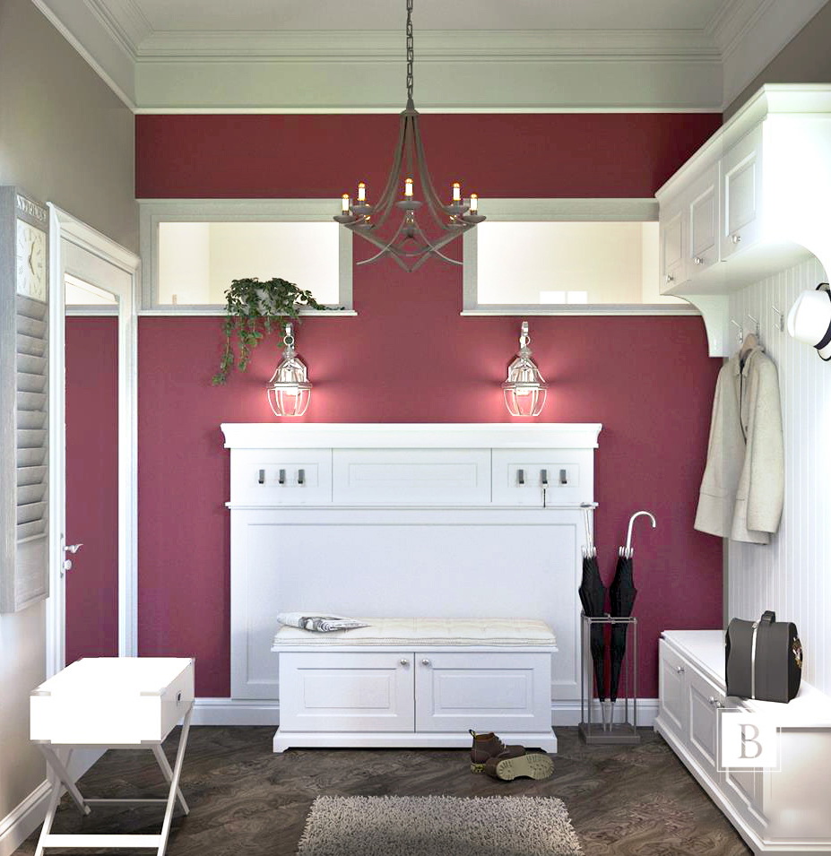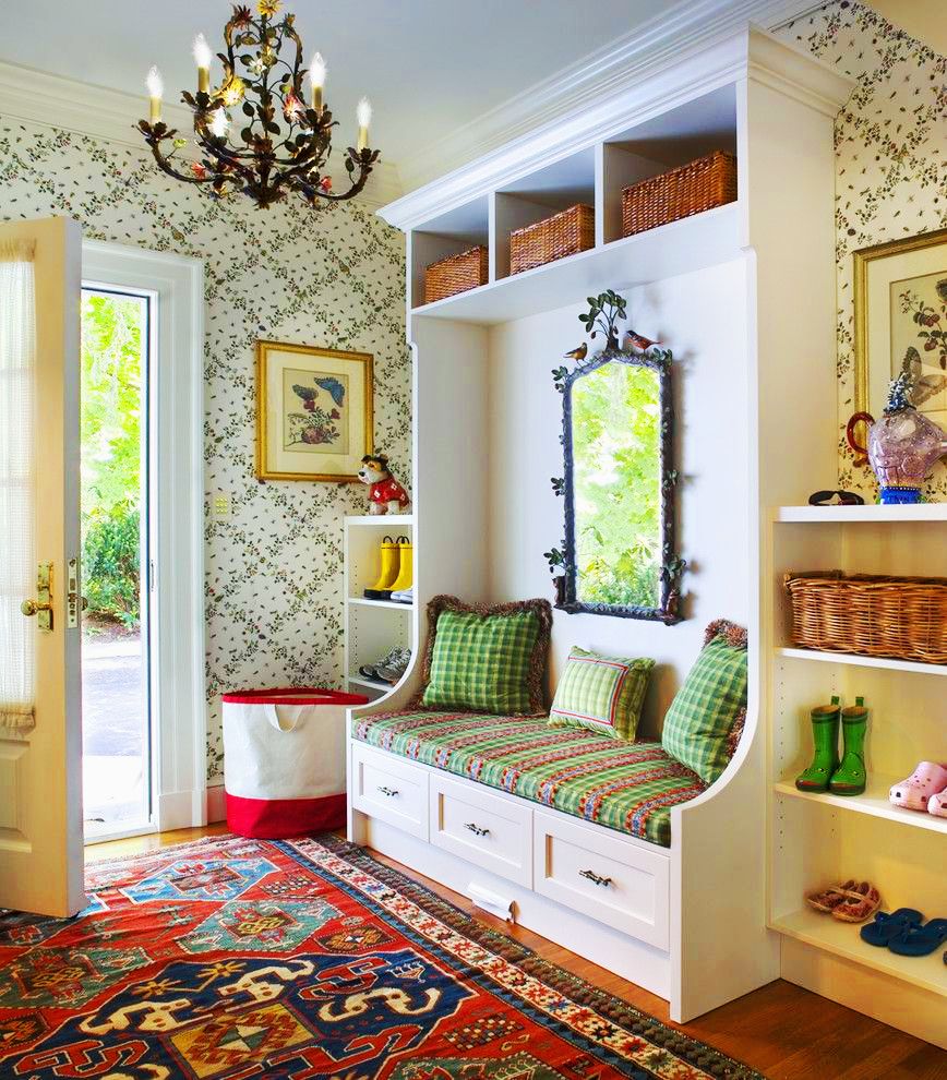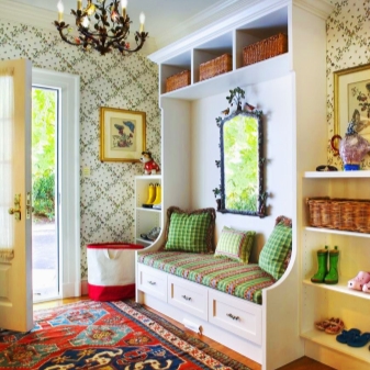 The original, but cumbersome version, which is suitable for a country house. Tumba is a set of three separate items. The central place is occupied by a modular wall with shelves at the top and a sofa at the bottom. Under the seat - drawers.On either side of the structure there are two open pedestals with shelves. White neutral color of furniture emphasizes textiles, carpet and wallpaper in green and red shades. Country hallway is suitable not only for storing shoes and belongings, but also for rest.