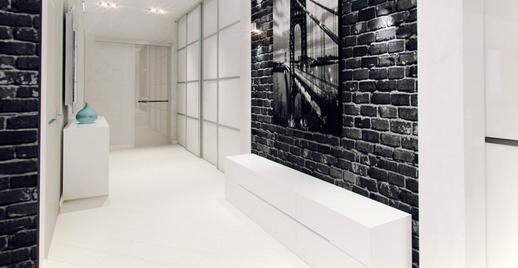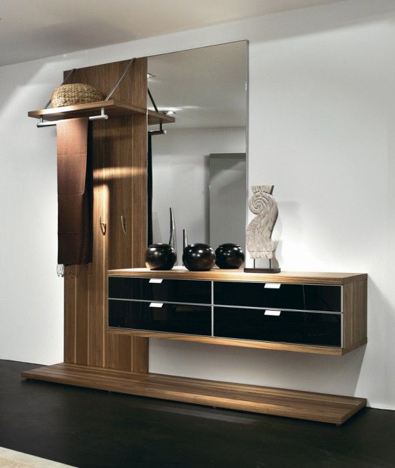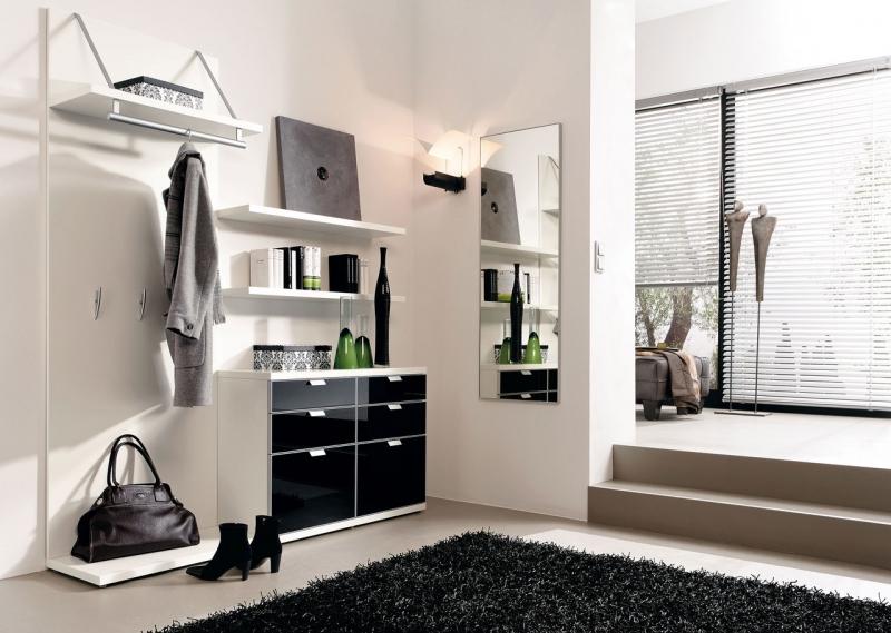 Modern and discreet option. Suspended drawer with retractable drawers suitable for storing things inside or on top. The design is completed by a narrow wall with hangers, a shelf at the top and long on the floor. The bottom part is suitable for storing shoes. Black doors and decor on the shelf blend harmoniously with the walls and floor in basic colors.