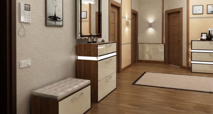 In order to use space more ergonomically, a cabinet in the corridor is best located near the entrance, adding ottoman or stool to it. The undoubted advantage is the presence of a number or in front of a mirror to bring yourself in order. Such furniture will allow you to gather and undress directly next to the door, so as not to carry dirt throughout the room. If the thumbs have opening doors, then it should be borne in mind that to open them you need a distance.