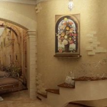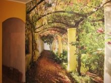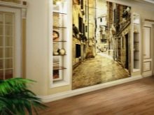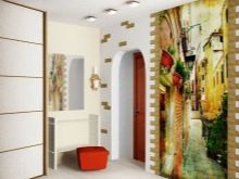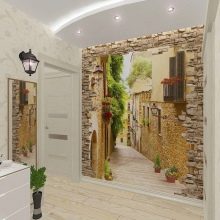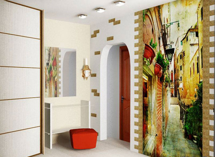 Photowall-paper can occupy all surface of a wall or an accent zone. If there is not enough free space in the hallway, it is worthwhile to beat it with a cunning device (for example, in the form of windows or pictures). When installing photo wallpapers you need to follow so that the image is not deformed: it spoils the look of the whole interior. You can place the wallpaper on the wall with an arch that will help create an unusual effect and expand the room.