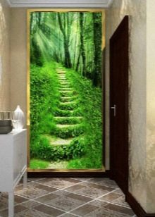 - Eco style in the design of the premises today is the most popular. Photowall-paper with the image of natural landscapes (for example, with a view of the castle, wild animals,plants). The wallpaper of this hallway is usually light (diluted green, sand, light brown).