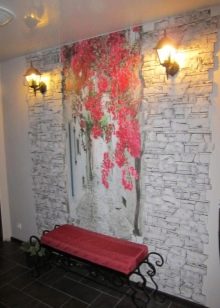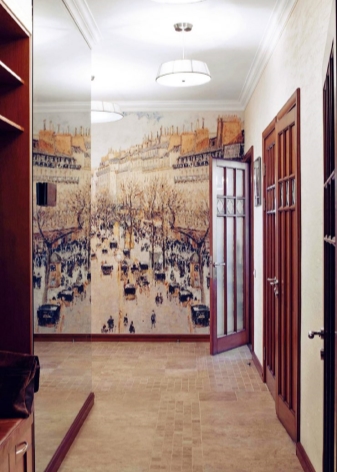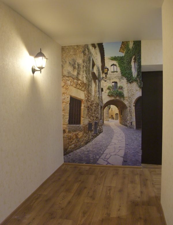You can decorate the wallpaper in the hallway in different ways (on the wall, doors). They look beautiful with different materials, so they can harmoniously be placed next to wood, stone, brick: this is how the picture looks original and creates the illusion of professional design in a particular style. The combination of photowall-paper with massive materials emphasizes its lightness and creates a balance in the layout of style objects.