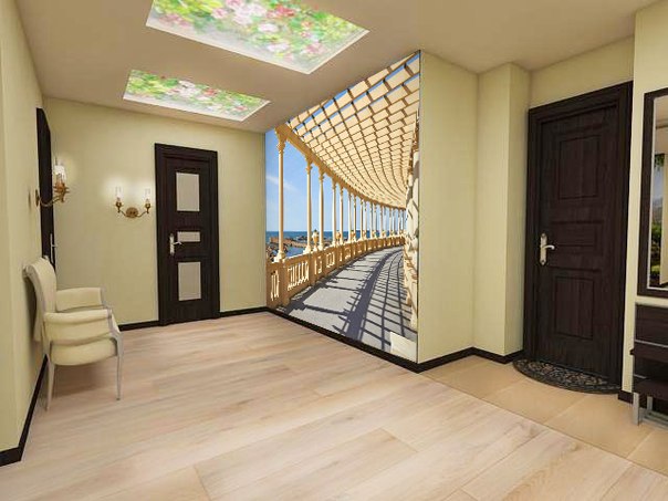 The color scheme of the photo wallpaper plays a big role in the design of the hallway. Since the hallway is a place that does not have enough light, it is preferable to choose for its design drawings in bright shades of the color palette. This will add the illusion of light and space, make the atmosphere relaxing and bring the feeling of home comfort into the space. Shades should be warm: cold colors change perception and make it bored.