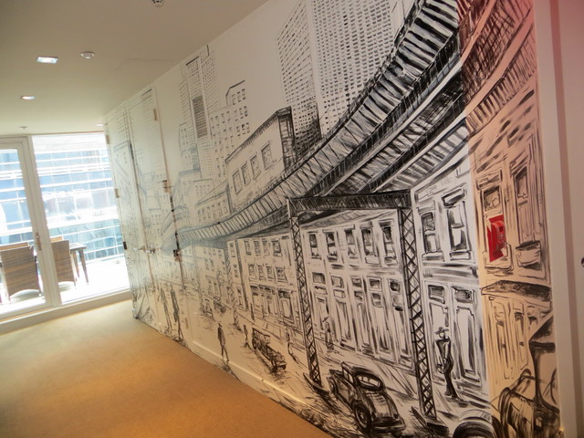 - Interior in modern style is a classic of large rooms: for such a hallway, you can choose a photo wallpaper with a large image of objects and patterns (for example, cityscapes and architecture) of various shades.