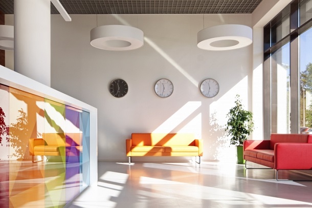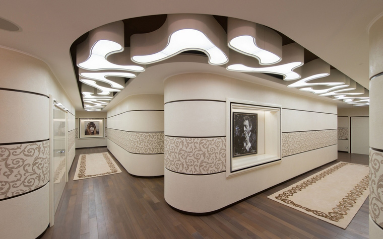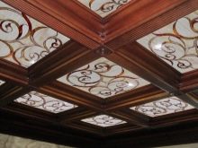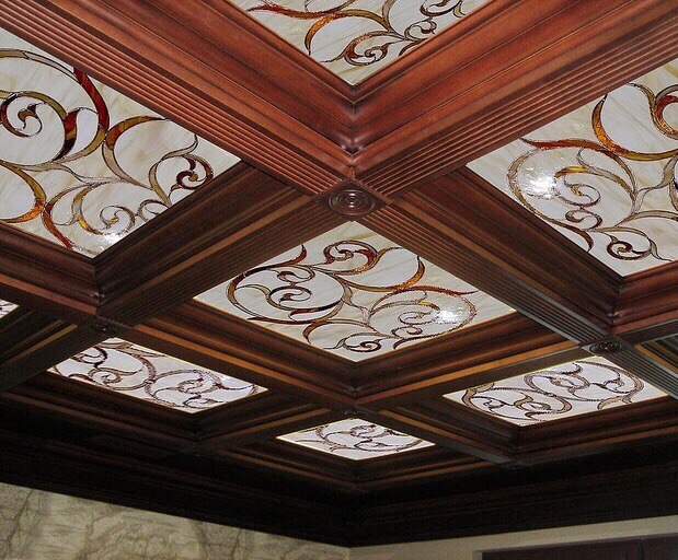 Incredibly beautifully artistically executed stained glass ceilings in illuminated ceiling lights. If daylight is not available, then in this case a lighting system is created between the slab and the stained glass itself.
