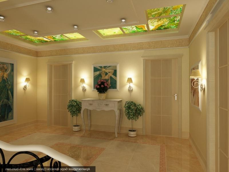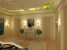 Ceiling decoration, as well as the floor and walls, must obey a single architectural focus of the interior design of the house. If the hall is organized as a separate design room, then the ceiling should correspond to the finish of the floor and walls.If there is a shiny component in the material of the walls and the floor (marble or glossy panels on the walls), you can safely use the gloss on the ceiling, and, on the contrary, when the muted matte finish of the room on the ceiling is also desirable to withstand a dull effect.
