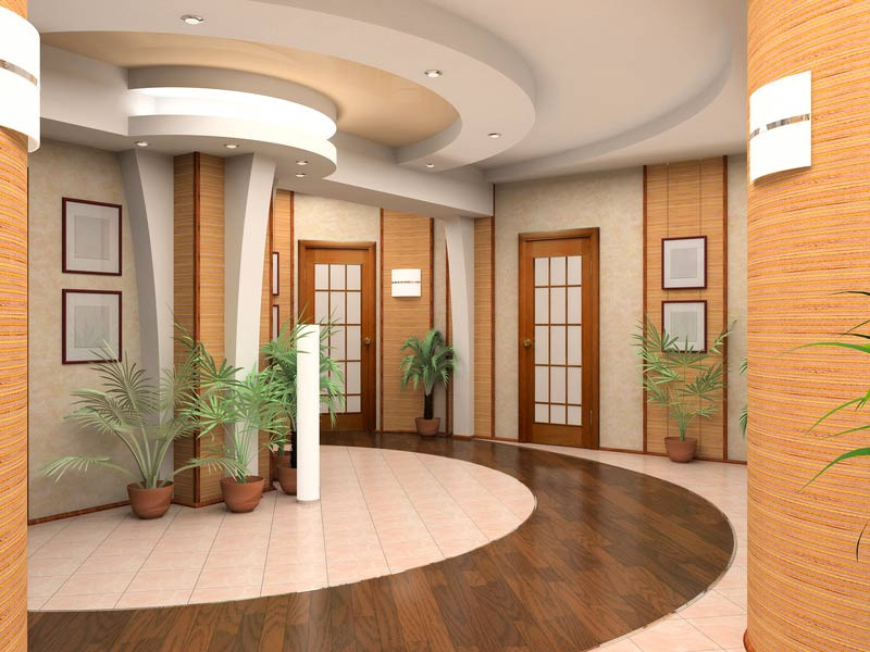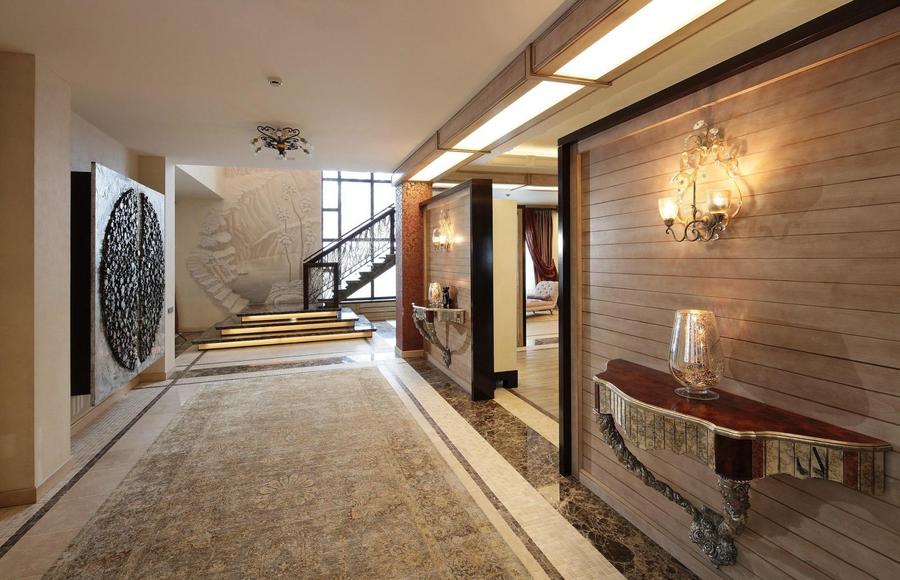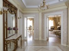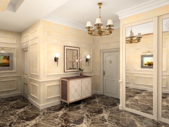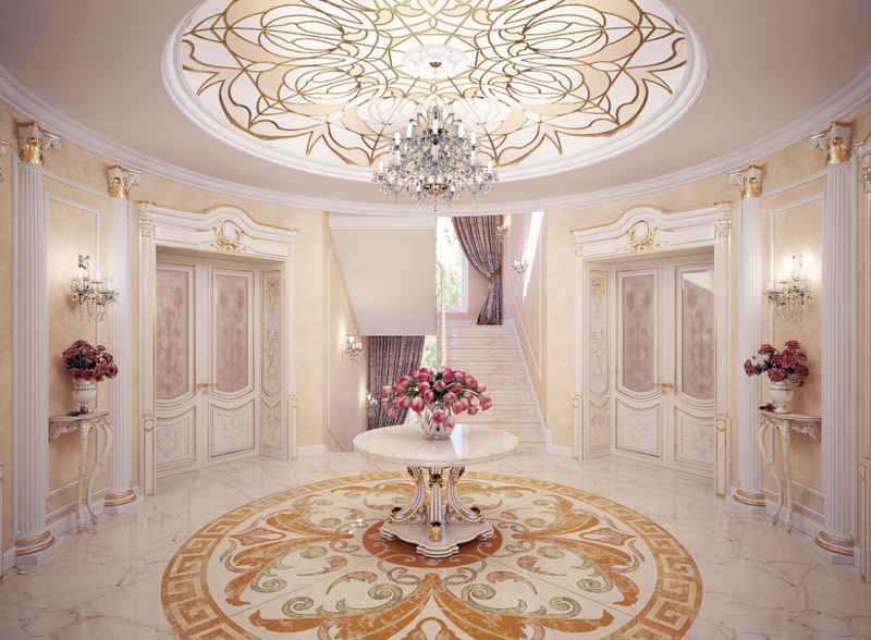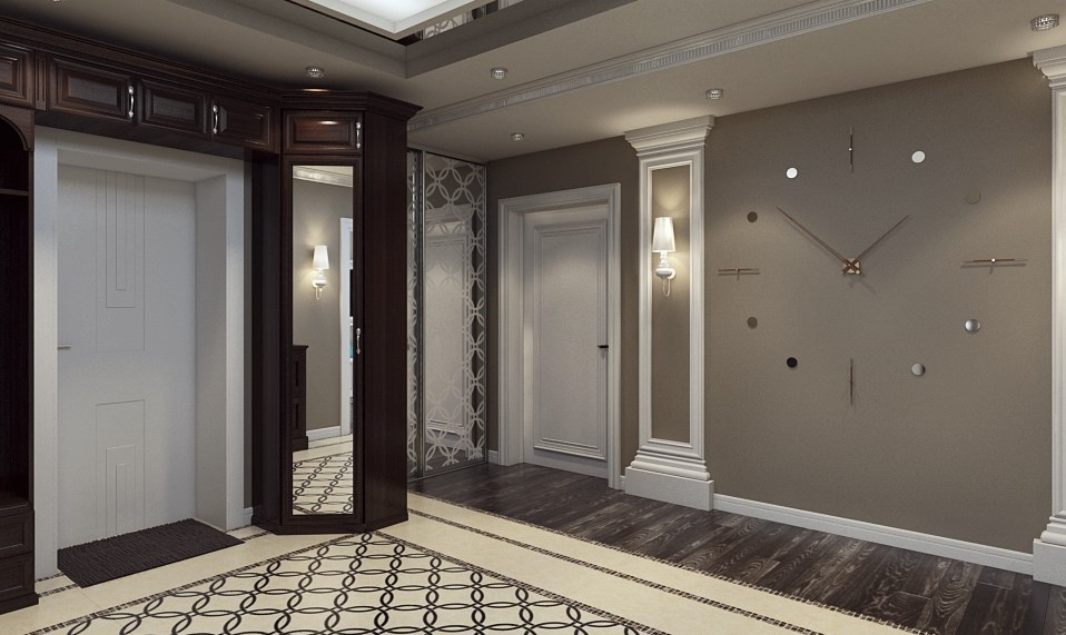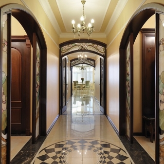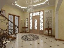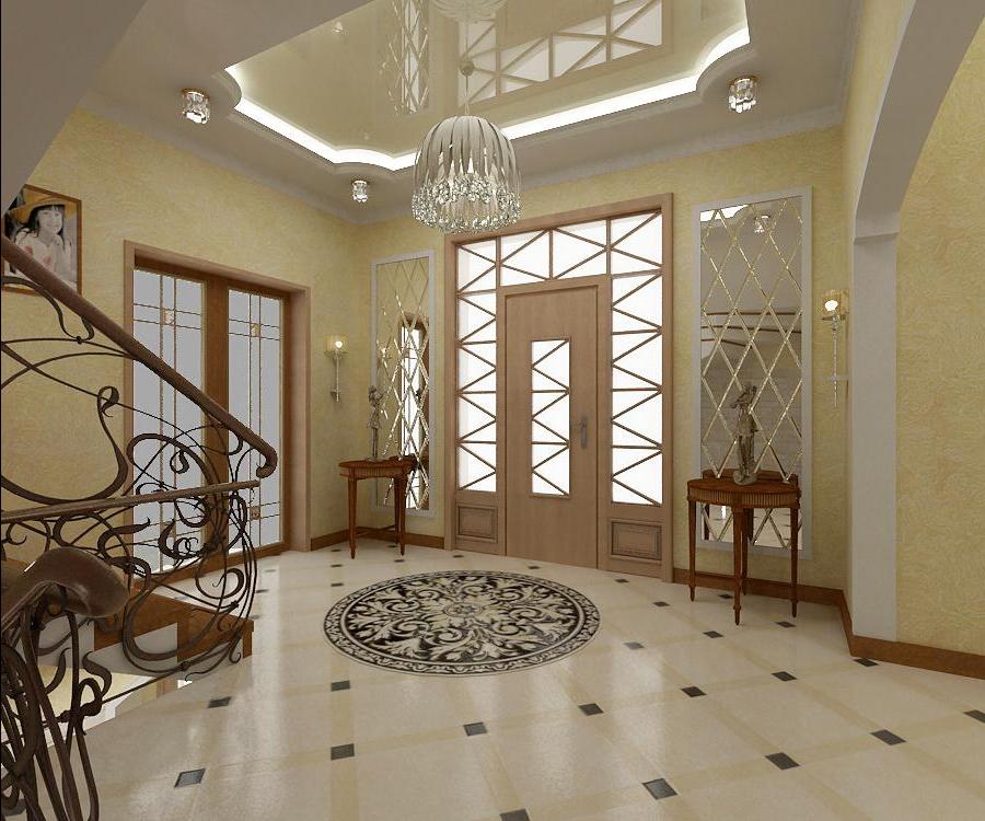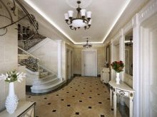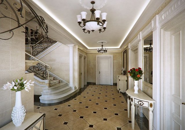 The choice of flooring, decor of walls, ceilings, corresponds to the concept of architectural style, which should correspond to the elements of the interior of the hall. If this is a classic, then both the flooring and the decoration of the walls and ceiling should be in this architectural style. For another style, all the components of the finish must also be interconnected. For example, it will be strange to look stucco with gilding on the ceiling with ceramic tiles with a pattern of sea boulders.