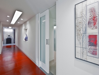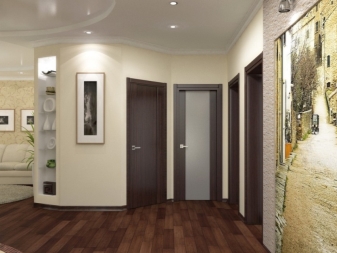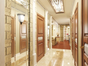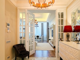 The presence of several doors leading to the hall obliges them to have the same design.In modern layouts, the hall may be a conditional part of the common space of the house, here sliding doors and transforming room partitions will be appropriate.