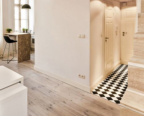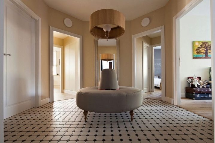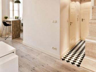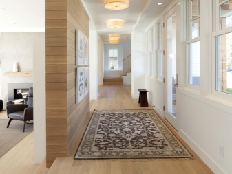 If the hall combines the functions of the hallway, then it is appropriate to use a combination of different materials: tiles and laminate, tiles and parquet. This allows you to create a durable, easy-care floor space in the entrance area, and a home environment in the main floor space.
