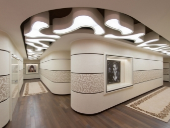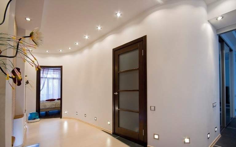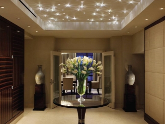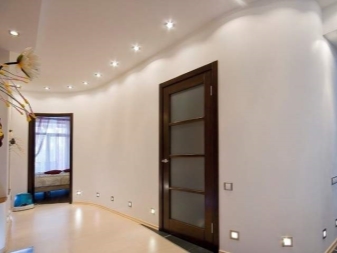 A significant role in the design of the ceiling ceiling lighting plays. Often, when constructing multi-layered ceilings, each level is illuminated with spotlights or LED strips. Each cascade has a separate output to the switch, which allows you to create different degrees of illumination in the hall, depending on the time of day.
