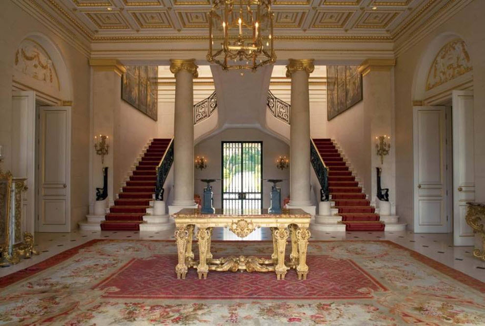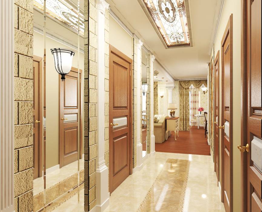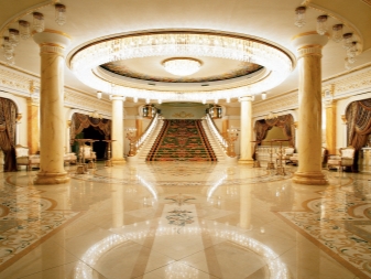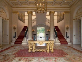 A large and chic hall, made in the Empire style, looks like a chic hall. This style supports exquisite stucco, expensive carpets, luxurious chandeliers and sconces, as well as the fundamental columns of marble.
