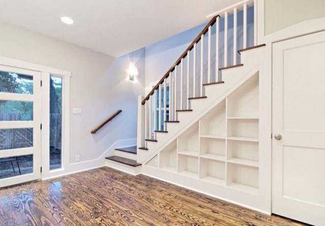 Storage space can be arranged under the stair design, this will mask the boring set of shelves and hangers.