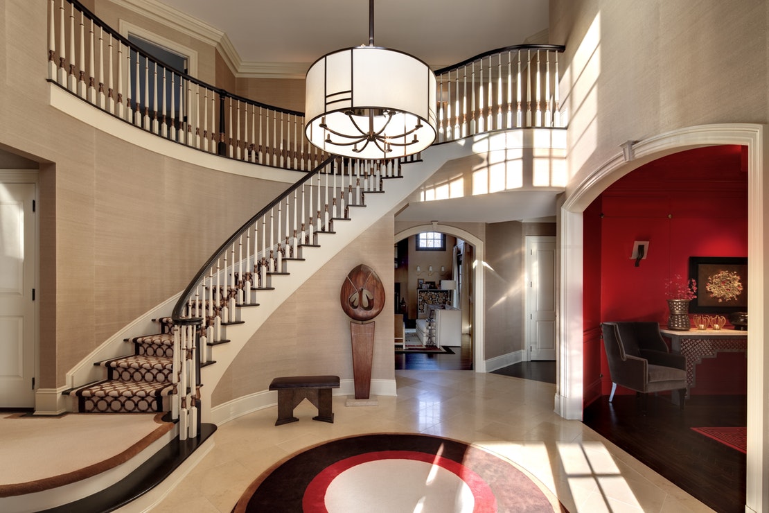 Curtains and draperies can be a bright accent in the room. The curtains will give comfort and help to combine the disparate details: the windows in the lobby and the windows on the stairs are decorated with the same curtains with lambrequins or with the same gold pickups.