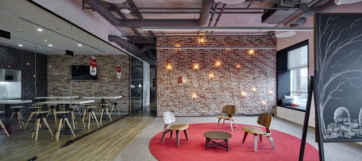 - Industrial design is created in style loft using the technical equipment of the infrastructure of the house as design objects: pipes, bare brick, pieces of concrete, graffiti, mostly gray, brown colors with the attraction of one or two large bright interior items.