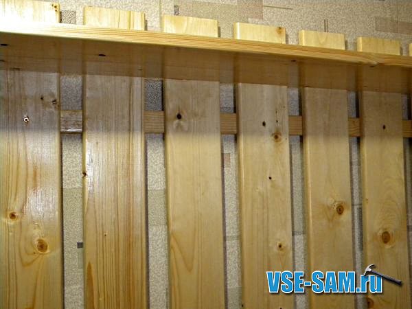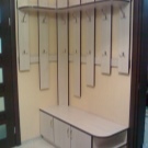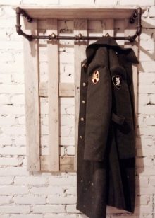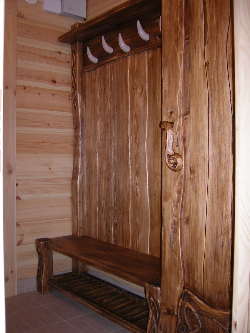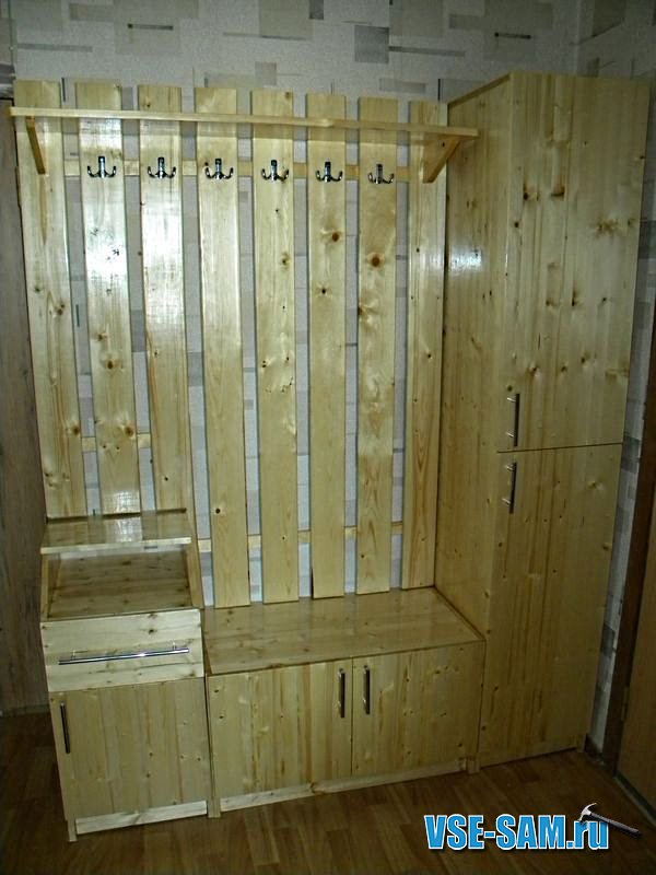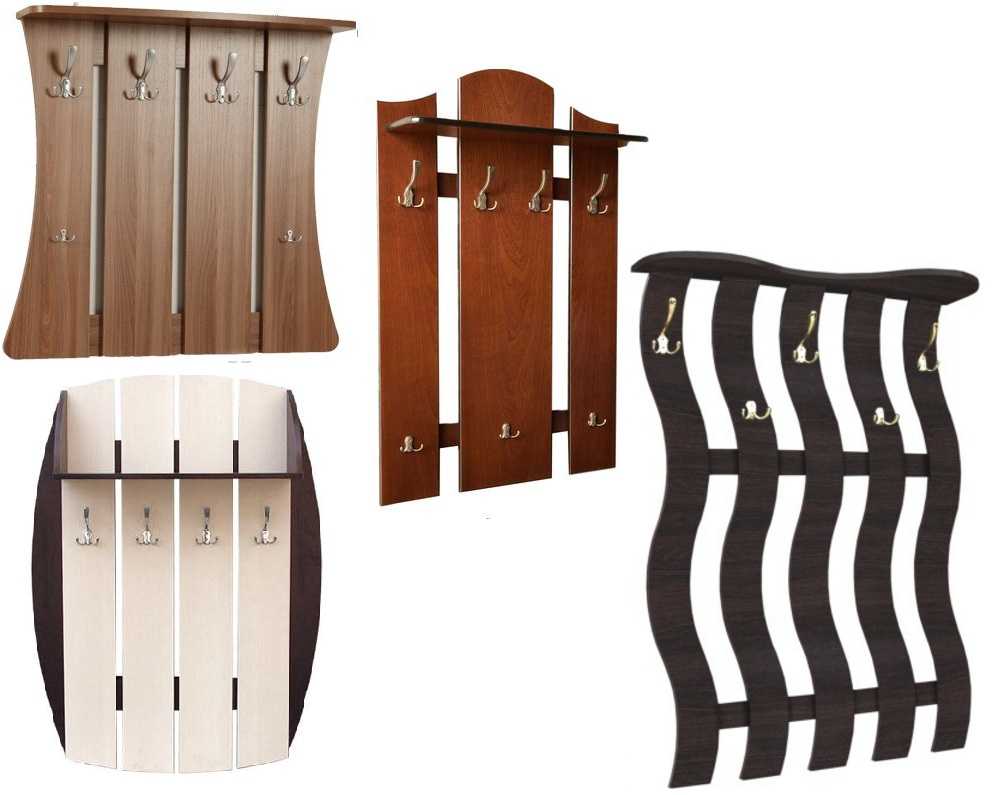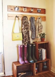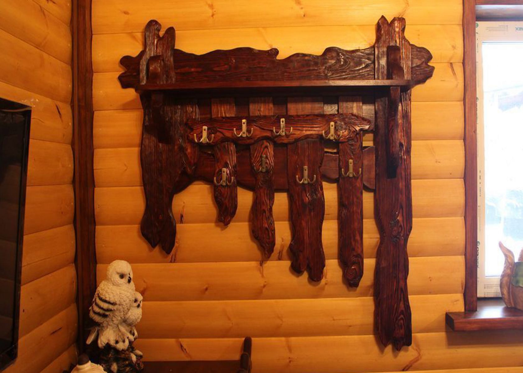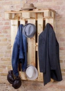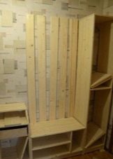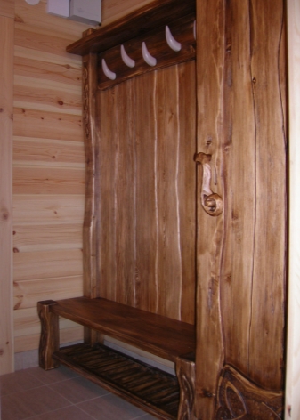 In addition to the cabinet and cabinets, you can make a wall hanger with hooks. To do this, it is enough to cut the required size from the shield, or a few narrow boards,which are interconnected by another transverse board. Vertical boards can be made curly by adding elements of contrasting color. The hanger is completed with hooks and the top shelf.