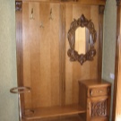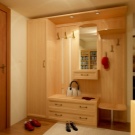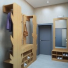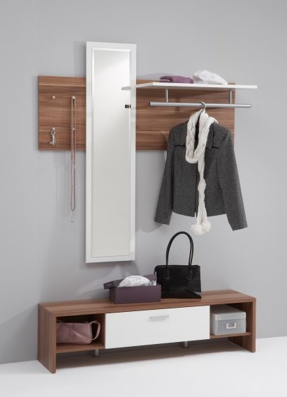Solutions for medium-sized rooms with a standard set of furniture for the hallway. It can include a small wardrobe, a small seat, cabinet or chest of drawers for small items, as well as several wall shelves.