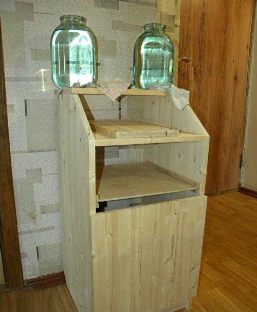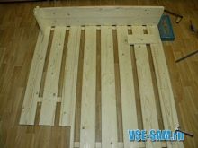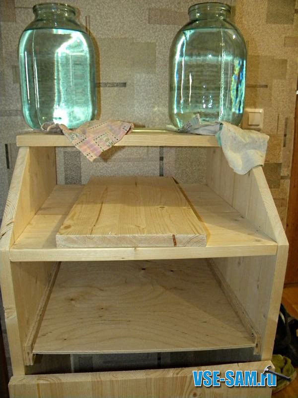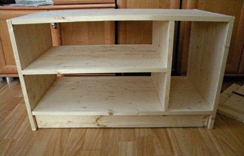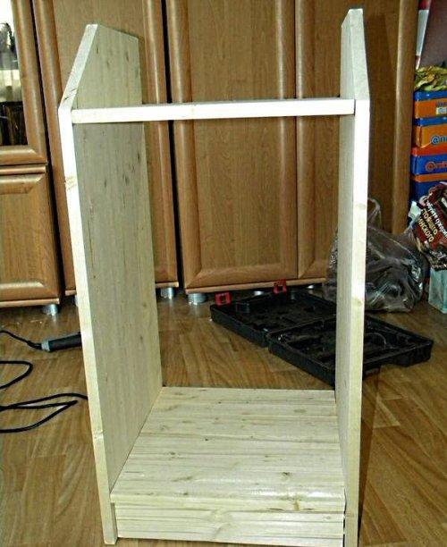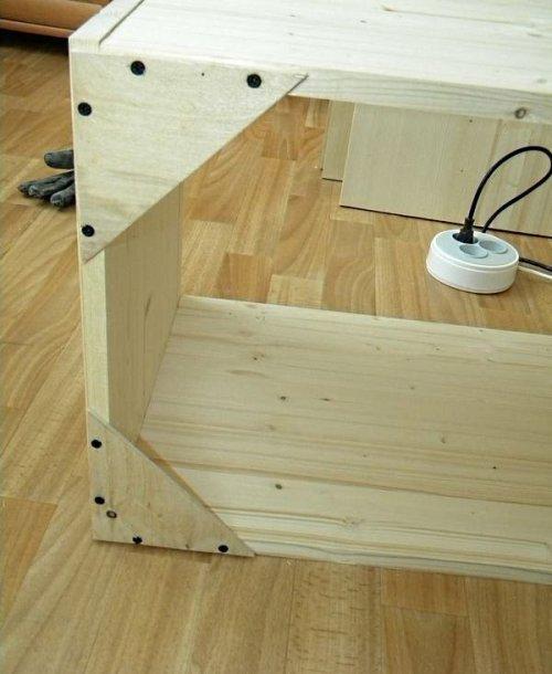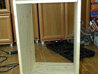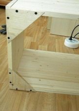 - we connect the sidewalls, the lower and upper base with the help of fasteners (the lower base should be located slightly above the floor a few cm). It is also possible to make a plinth from the furniture panel, which will close the gap between the floor and the lower base;