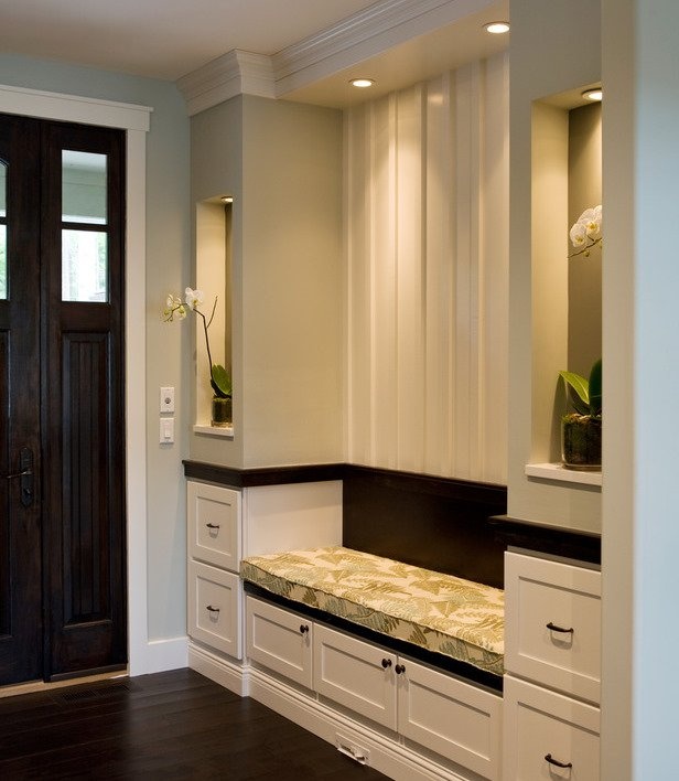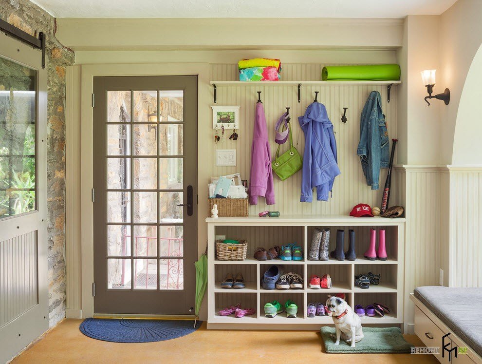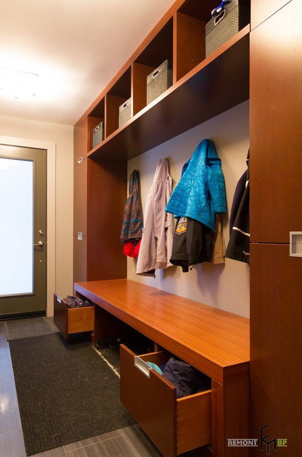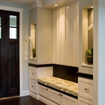 If you plan to do the hallway in a private house or at the cottage, it is better to create a more spacious environment. If space allows, a wardrobe or even a small dressing room, enclosed by sliding doors, is ideal for him. It is worth considering that this option will be somewhat more expensive.Deciding on the organization of the room, you should think about the seat, where it would be convenient to wear shoes. For more comfort, you can make it soft, for example, by covering the surface with foam rubber.