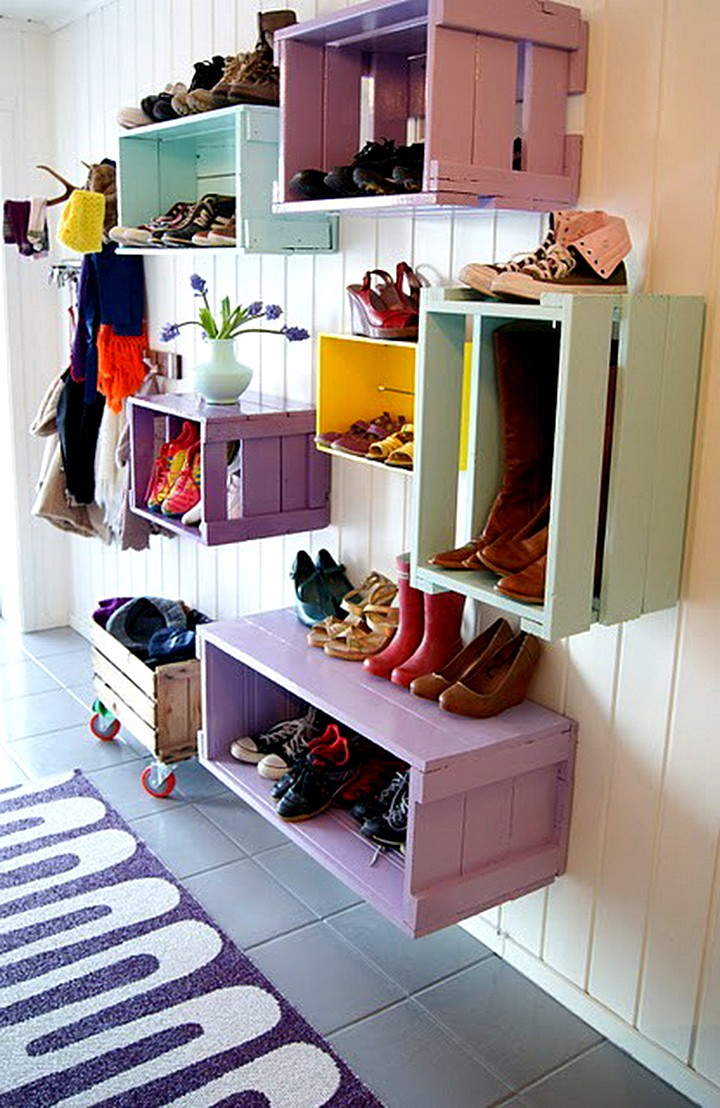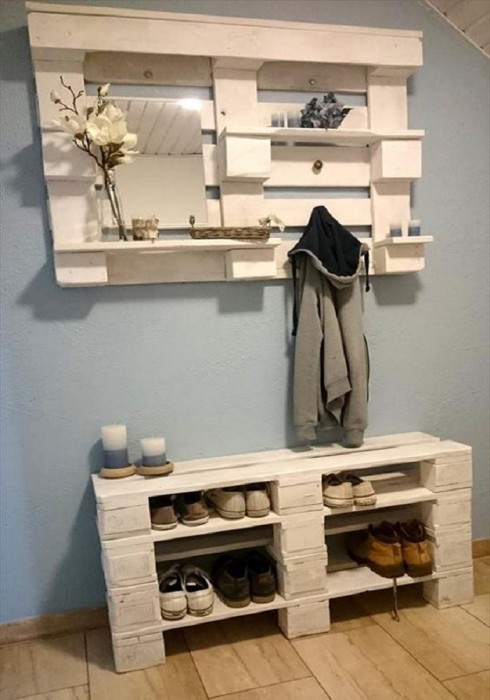 The furniture made of wooden boxes or a pallet looks original and very stylish.You can make an unusual closet, coat hanger, cabinet or shelf for shoes. The design is very fast and easy to assemble. The finished product can be painted with paint, supplemented with unusual fittings and decor. In the course can go already used in the house things that are no longer needed. It is enough to restore and ennoble them. Old doors, tires, vintage suitcases and chests, and even window frames can be used.