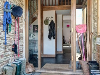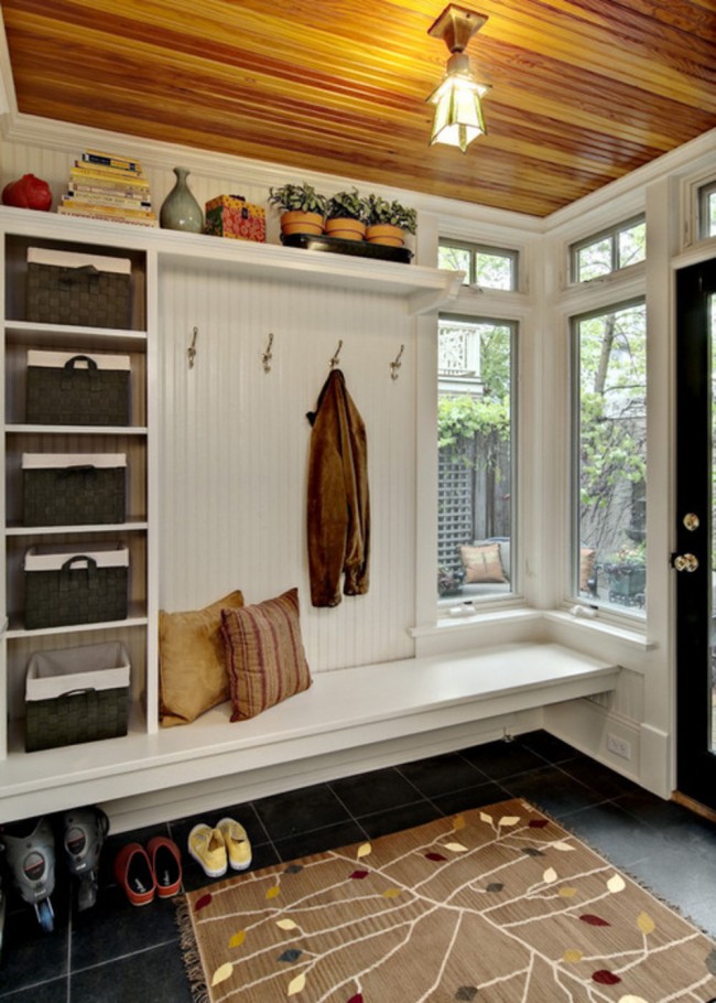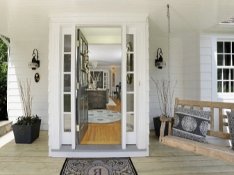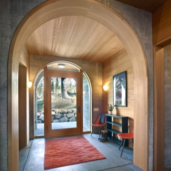 The porch-hallway is often found in village houses. You can arrange it beautifully and modernly, but you should use a minimum of furniture. One small closed cabinet will fit, as well as hooks and open shelves. It is good if the design will be harmoniously combined with the facade of the house.