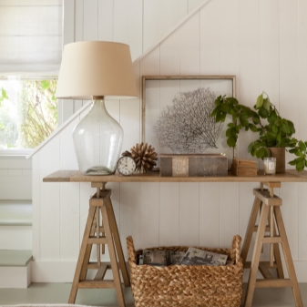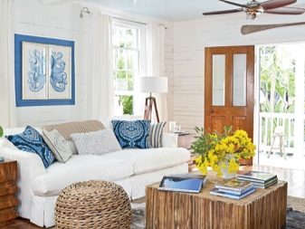 Often they make a wooden floor or even a wooden finish to the walls, and also wicker mats, baskets and armchairs can fit into the interior.