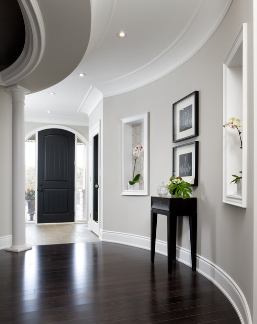 - Now gray is popular for the walls in the hallway. To make the design not boring, you can make two walls gray, and paint others in more unexpected shades. Under the ash shade fit blue, brick color or rich beige, as well as dark wood furniture or painted in light pastel colors.