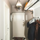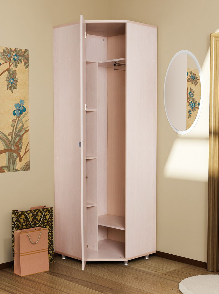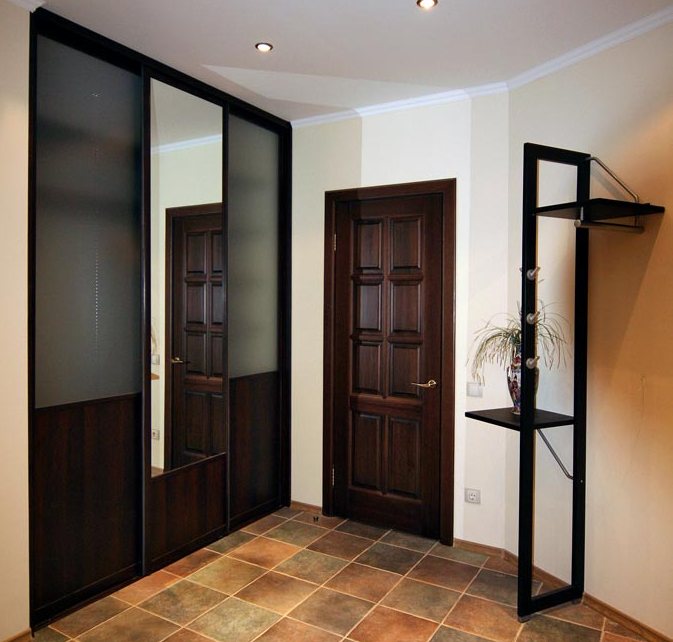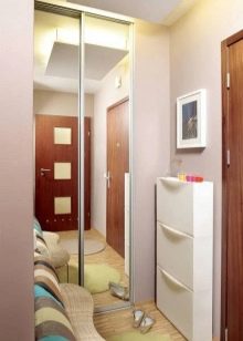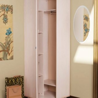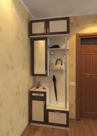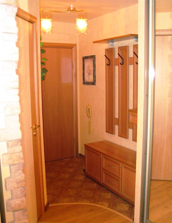 However, if there is no space for embedding the cabinet, then the free corner space is used. place narrow furniture along the wall (pencil case, compartment closet; the depth of objects should not exceed 40 cm). In cases where even a narrow cabinet cannot be installed, an open hanger is used (a row of hooks on the wall) complete with a shelf for hats and, possibly, a small shoe holder, which is additionally used as a place for sitting and changing shoes.