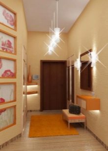 The final touches in the design of the room can help to eliminate the disadvantages of the interior. The use of properly designed lighting can create the very comfort that is so lacking. There should be a lot of lighting in the corridor. Options for the possible placement of lighting devices are listed below: