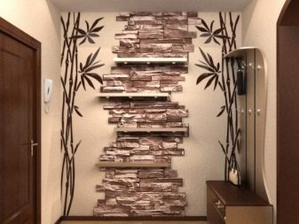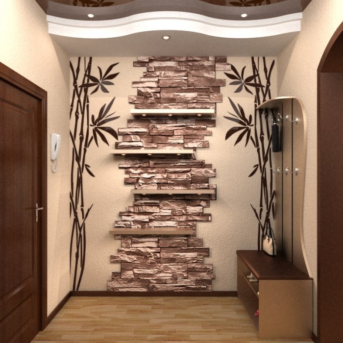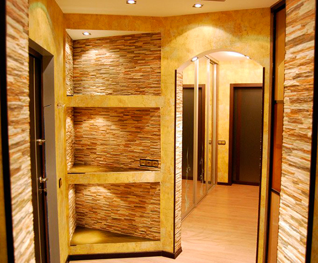 Visually expanding the space can use frescoes on the so-called accent wall. It is possible to replace the mural with a large original painting or photo wallpaper. In addition, you can lay out a frame of decorative stone around the arch or partially along the wall. It imitates natural material well and can perfectly fit into the hallway concept.