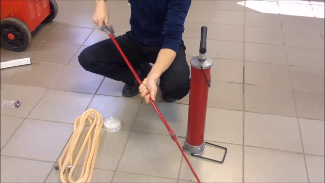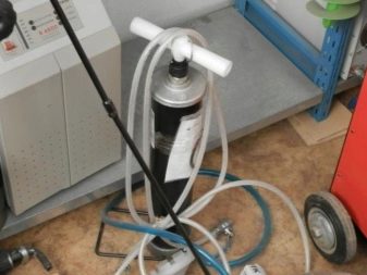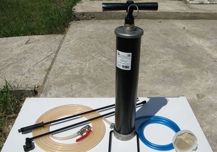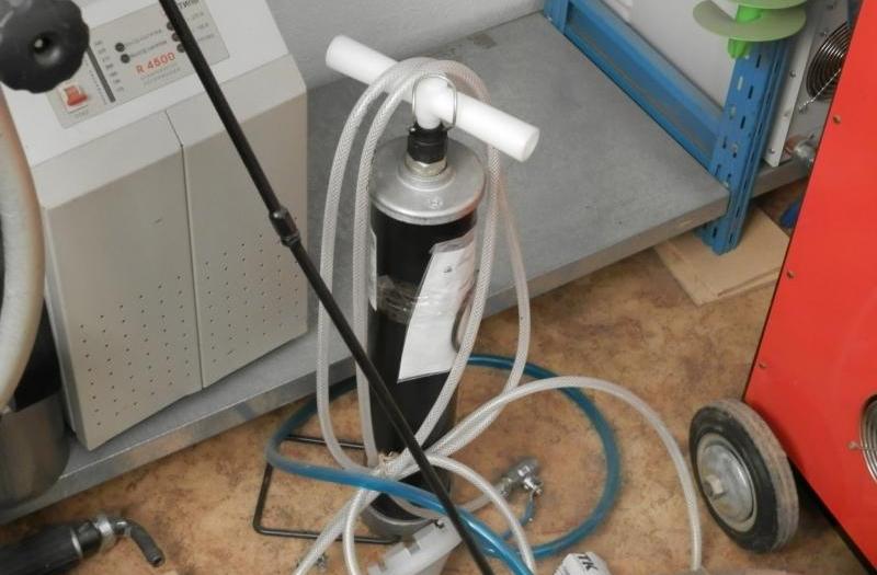In such a device, the injection of air is performed by analogy with a conventional pump when pumping. The cylinder contains several hoses, one of which is connected to the tank in which the composition for treating the bases is located.