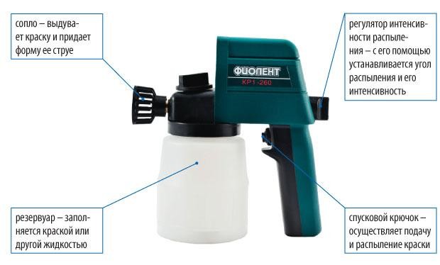 The main component of the instrument is attached to the tank - a handle with a button that controls the course of spraying of the composition, the angle of application and intensity. In addition, the spray gun is equipped with a nozzle, from which the solution is released onto the base.