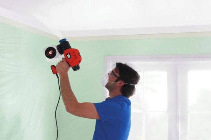 The use of a mechanical airbrush for whitening does not require a stepladder, because Special fishing rods available in the device will make it possible to paint over the ceilings and corners between the ceiling and walls, while being on the floor.