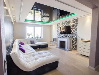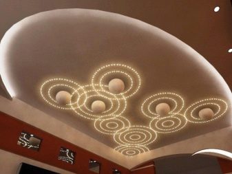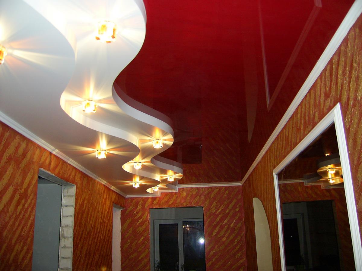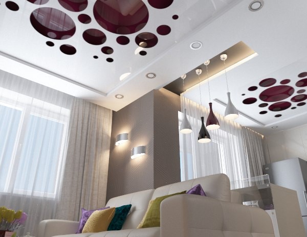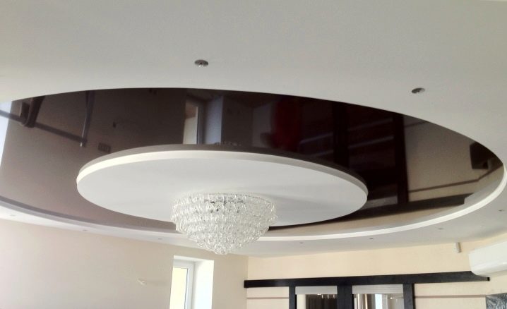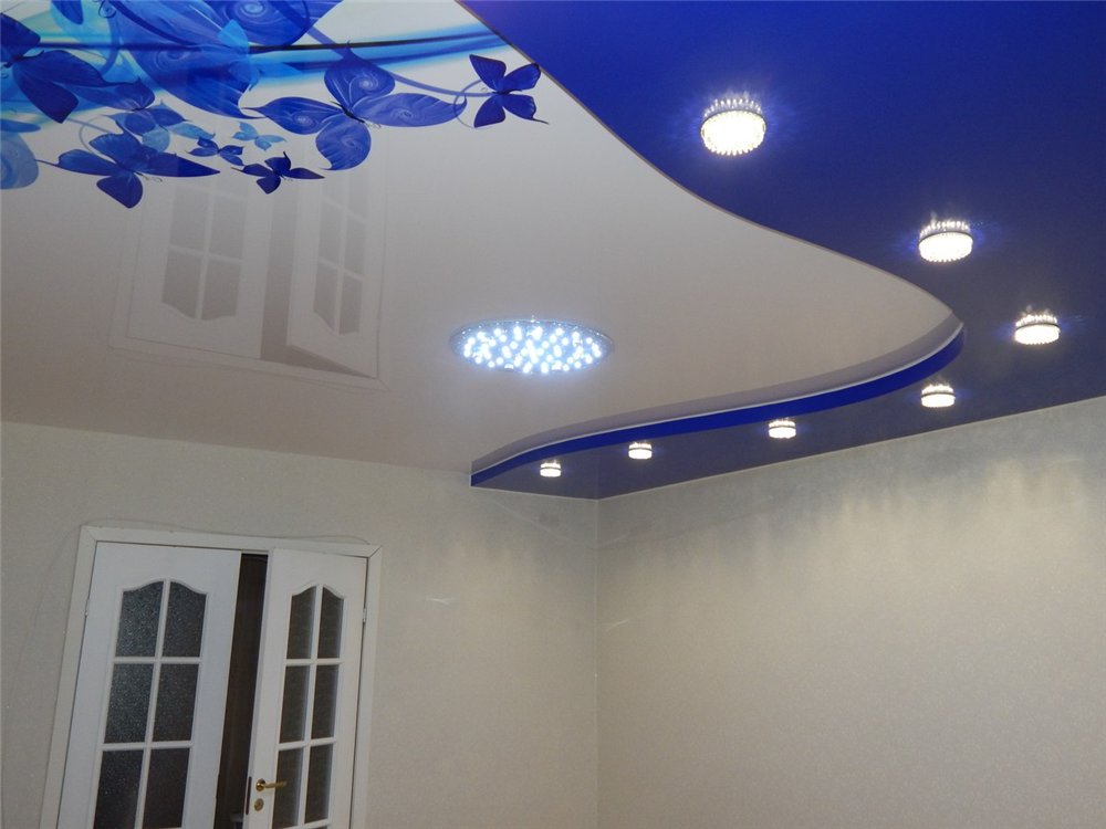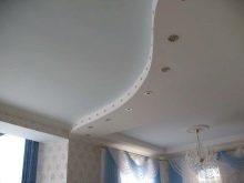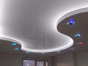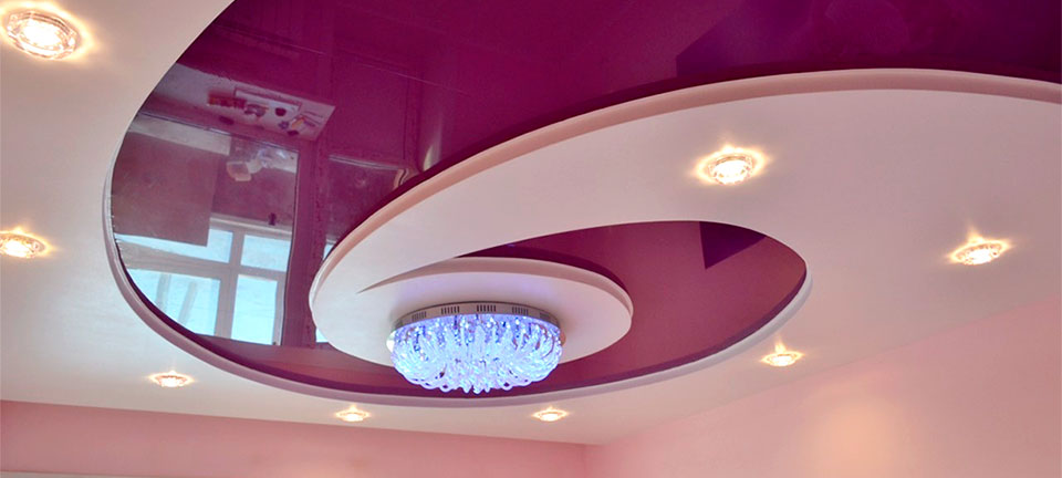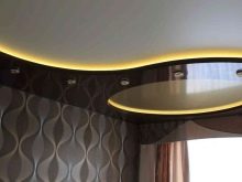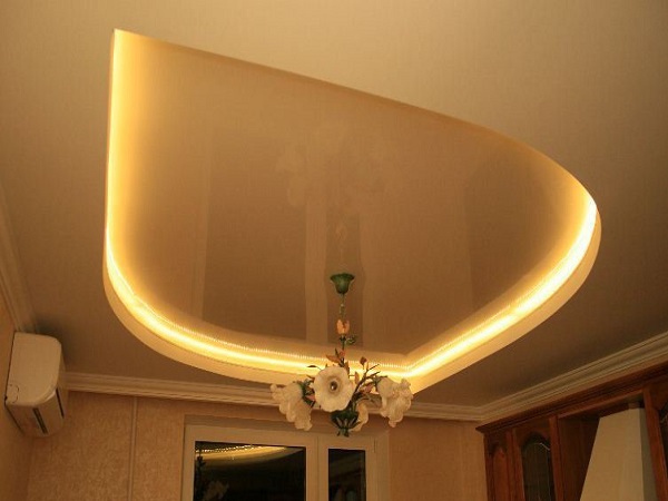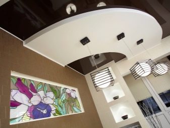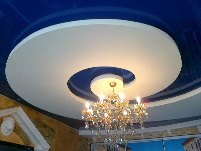 Quite often, 2 or more materials are used to organize the ceiling. For example, a plasterboard structure can be assembled around the perimeter of the ceiling in which to equip a niche for lighting devices, and for the second level to use a tension option.