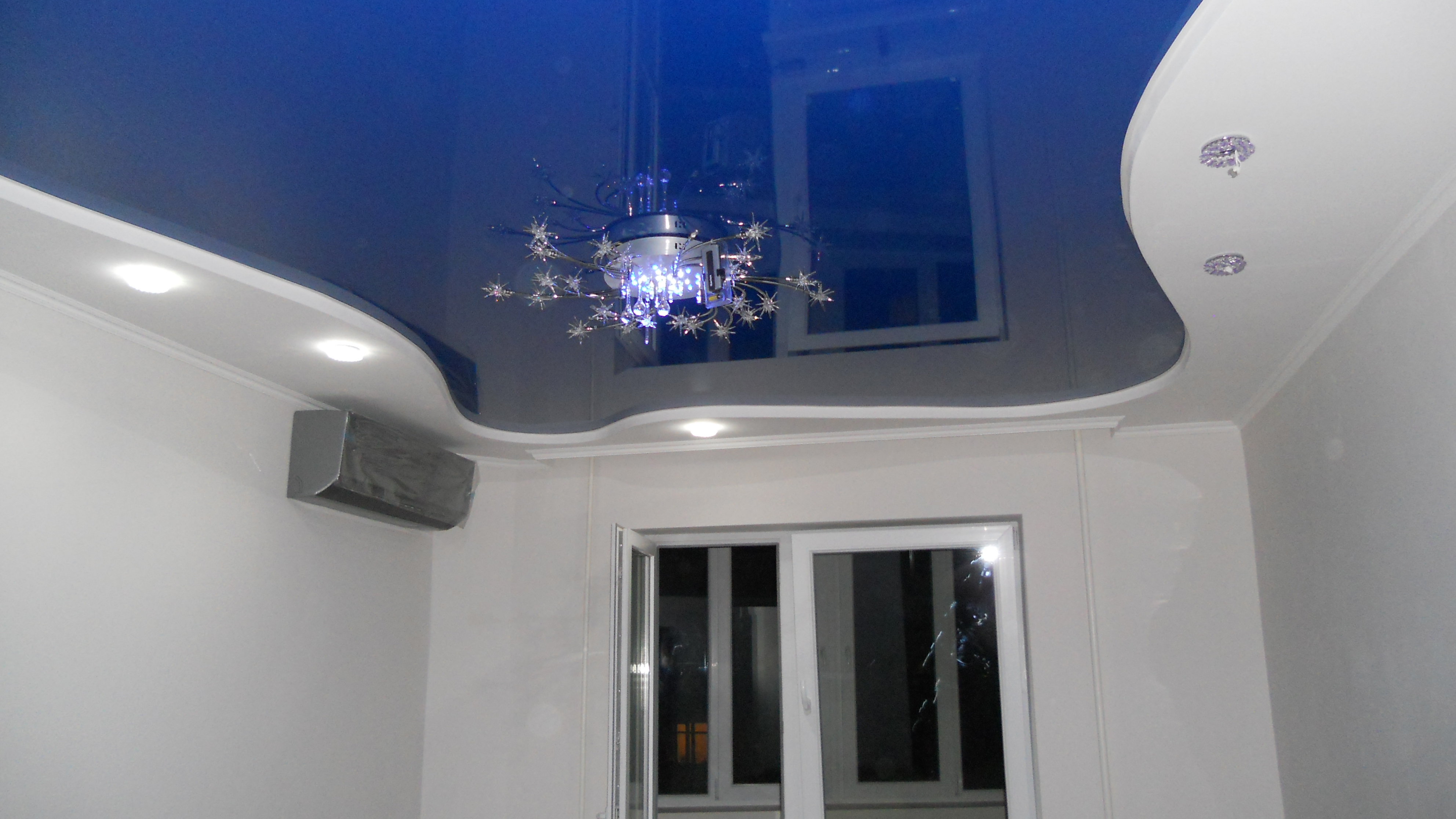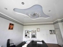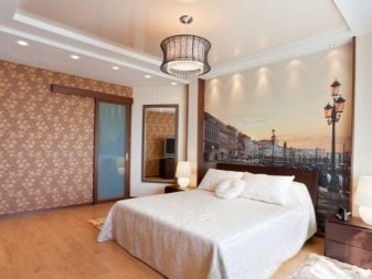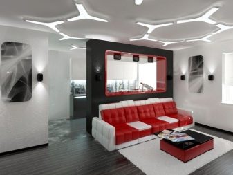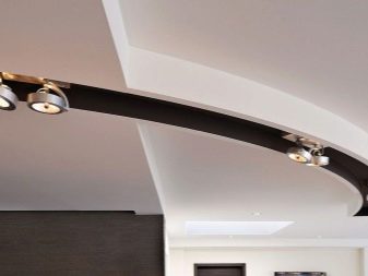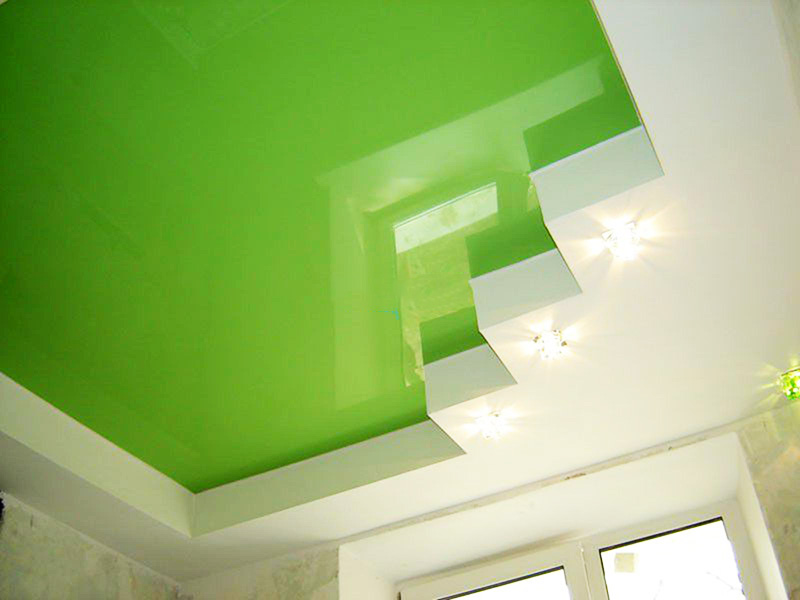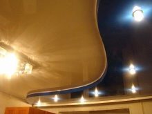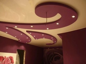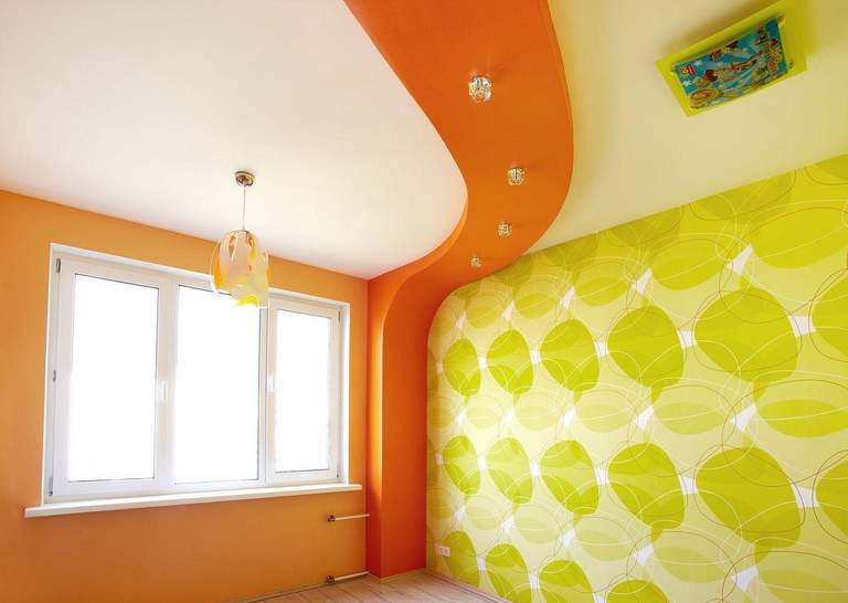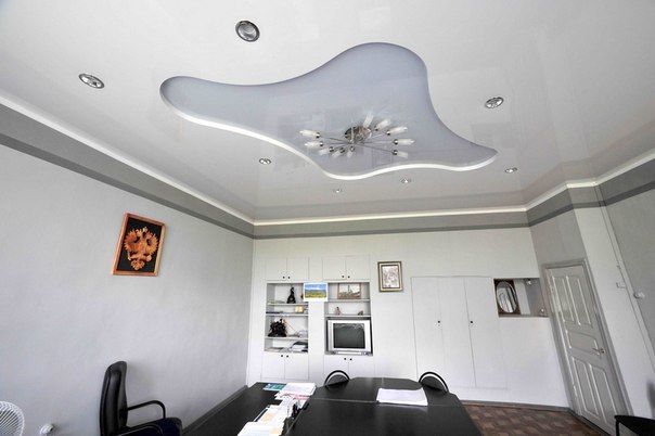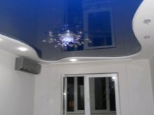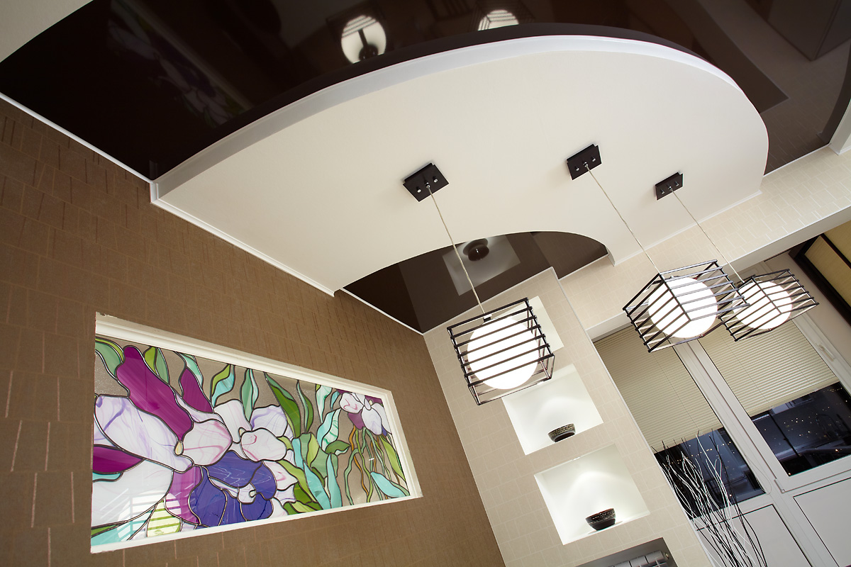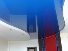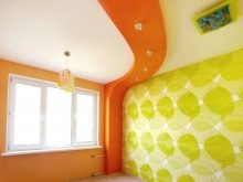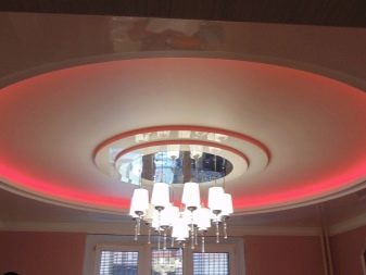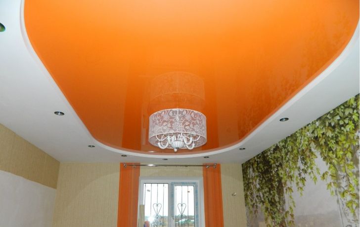 Quite often, 2 or more materials are used to organize the ceiling. For example, a plasterboard structure can be assembled around the perimeter of the ceiling in which to equip a niche for lighting devices, and for the second level to use a tension option.