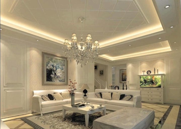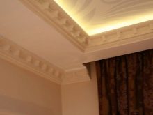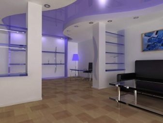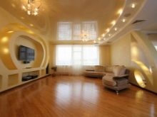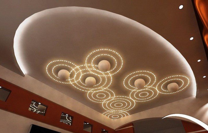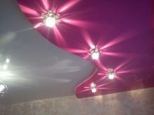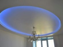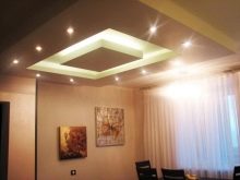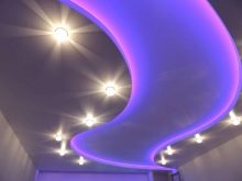 The two-level ceiling is equipped with several light sources, thanks to which it is possible to zone the space, to achieve the seclusion and romanticism of the atmosphere. The organization of a multi-level ceiling should not be a separate construction operation, it is included in the complex of repair work, being its final part.