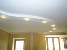 Plasterboard ceiling is not recommended for use in the kitchen (it can absorb various odors, in addition, it is combustible material) and in the bathroom (excessive moisture will be detrimental to the material, which will affect its appearance and durability). In general, the system is characterized by affordability, ease of installation, good thermal and sound insulation performance, the ability to create various forms and use the various methods of finishing.