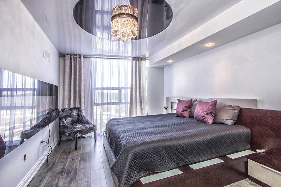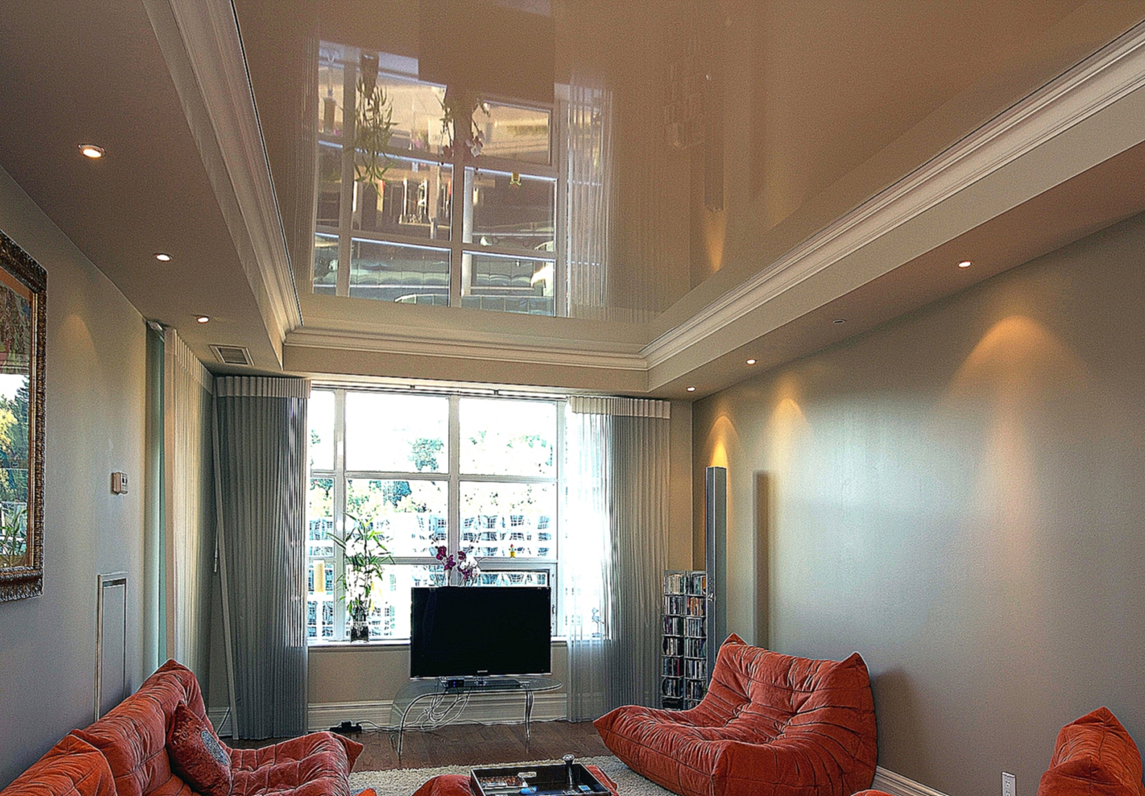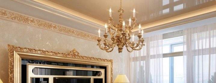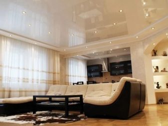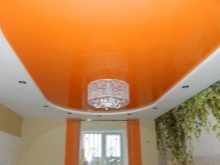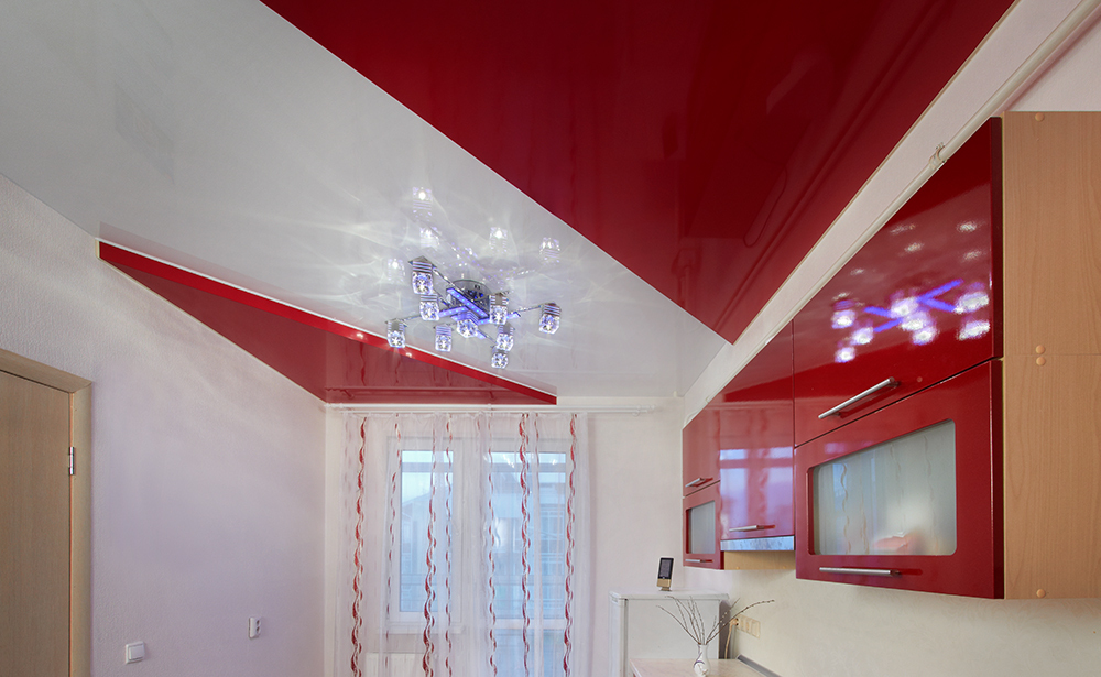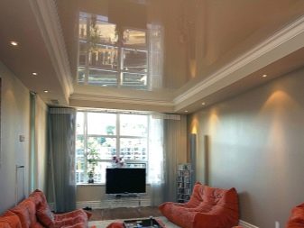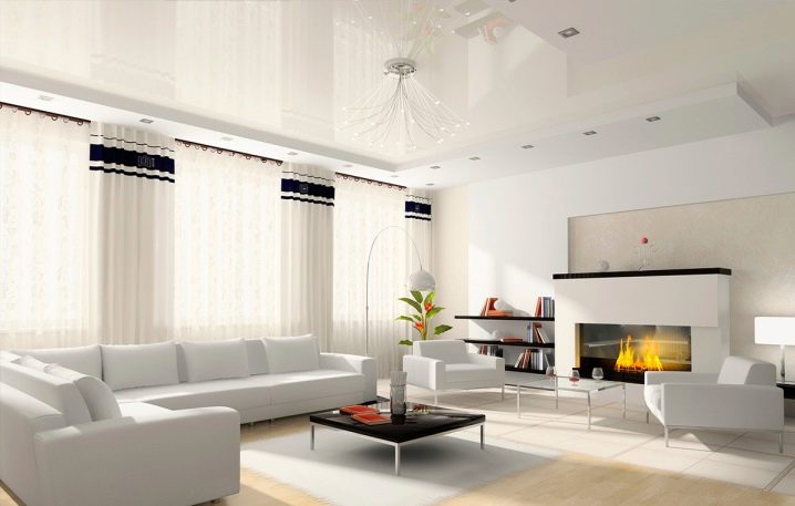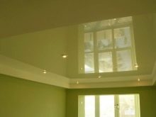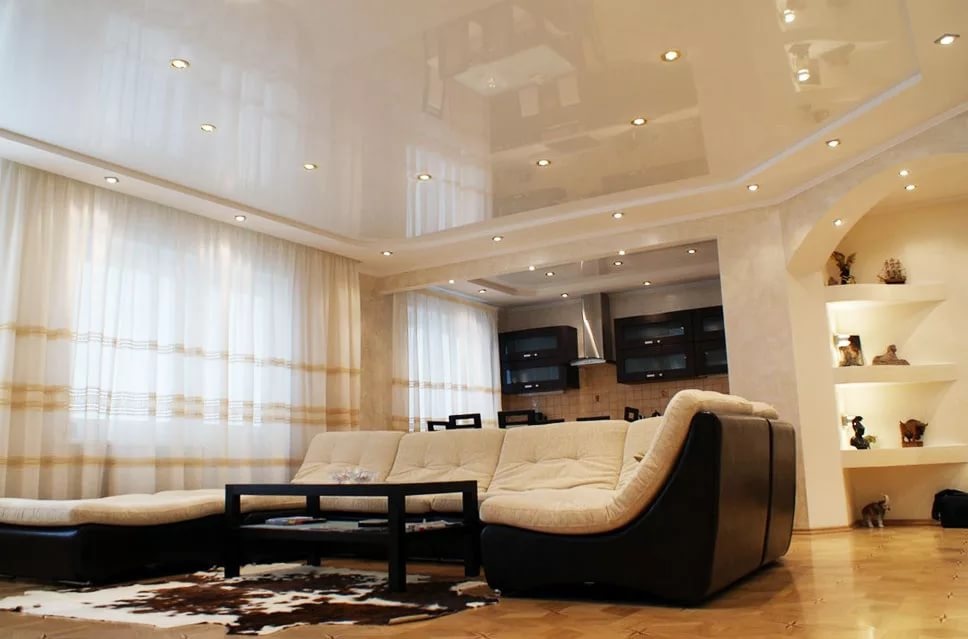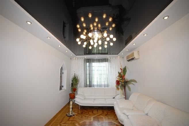 - Glossy. They have a reflectivity up to 90%, due to which a mirror surface effect is achieved. It is believed that the glossy ceiling allows you to visually increase the area of the room.However, this statement is true only with the correct choice of the color of the ceiling.